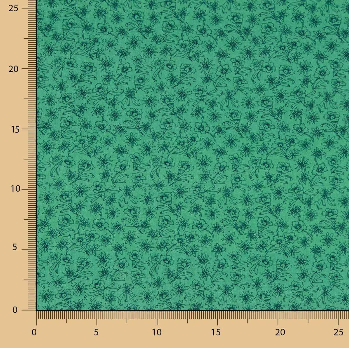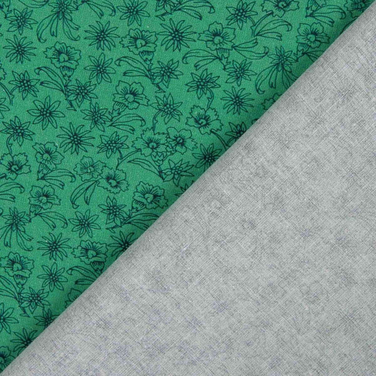 Este vibrante popelín de algodón 100% en un tono verde turquesa cuenta con un delicado estampado floral en un verde más oscuro, lo que le da un acabado elegante y fresco.