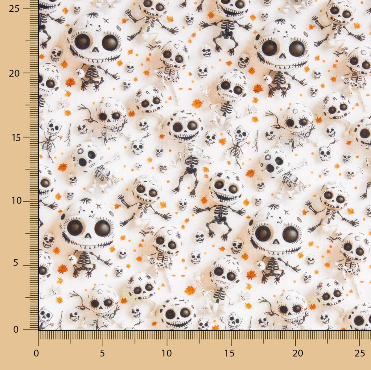 Tela de popelín de algodón con estampado digital de dibujos “terroríficos” infantiles de esqueletos, un estampado con leve sombreado para un efecto 3D vivo en multicolores.