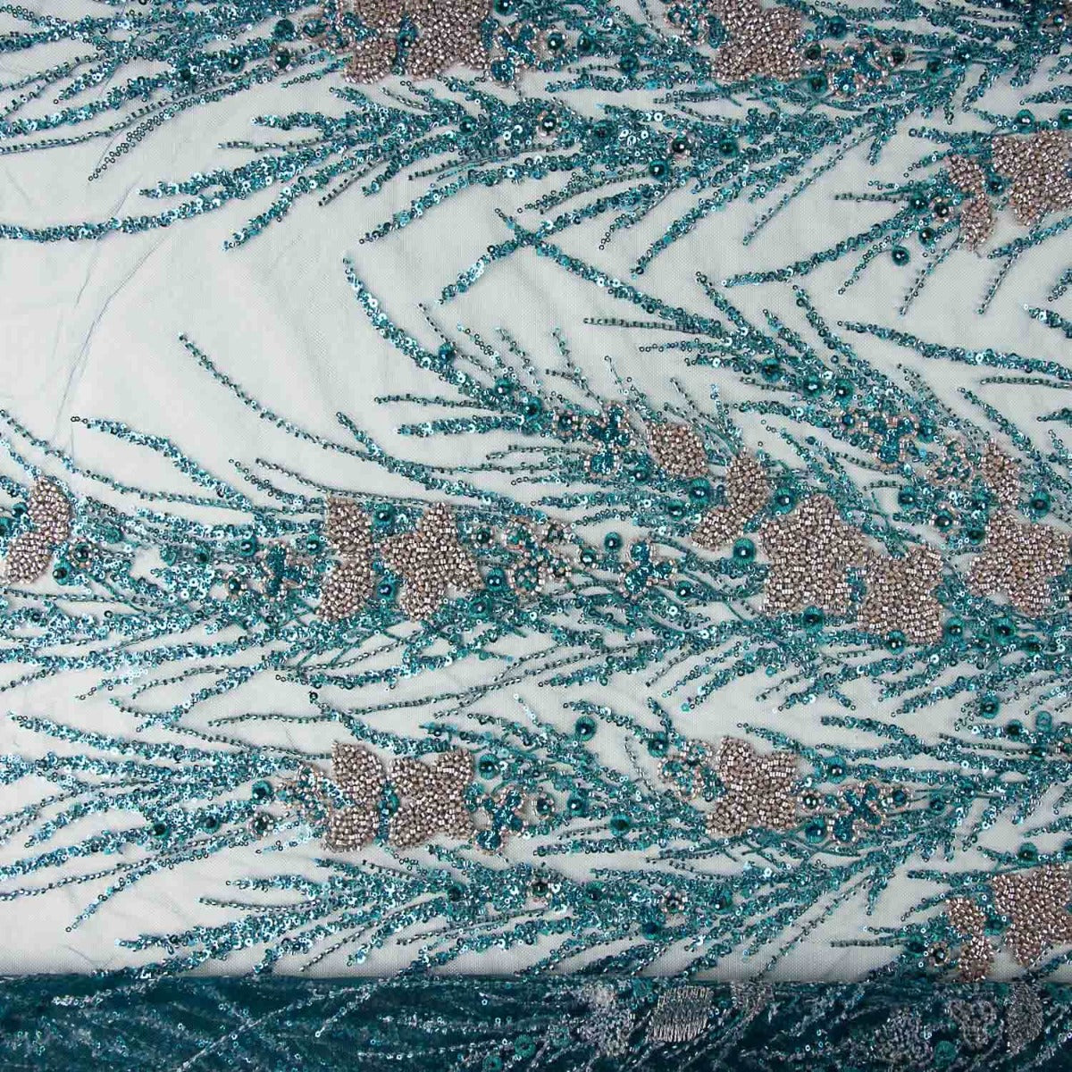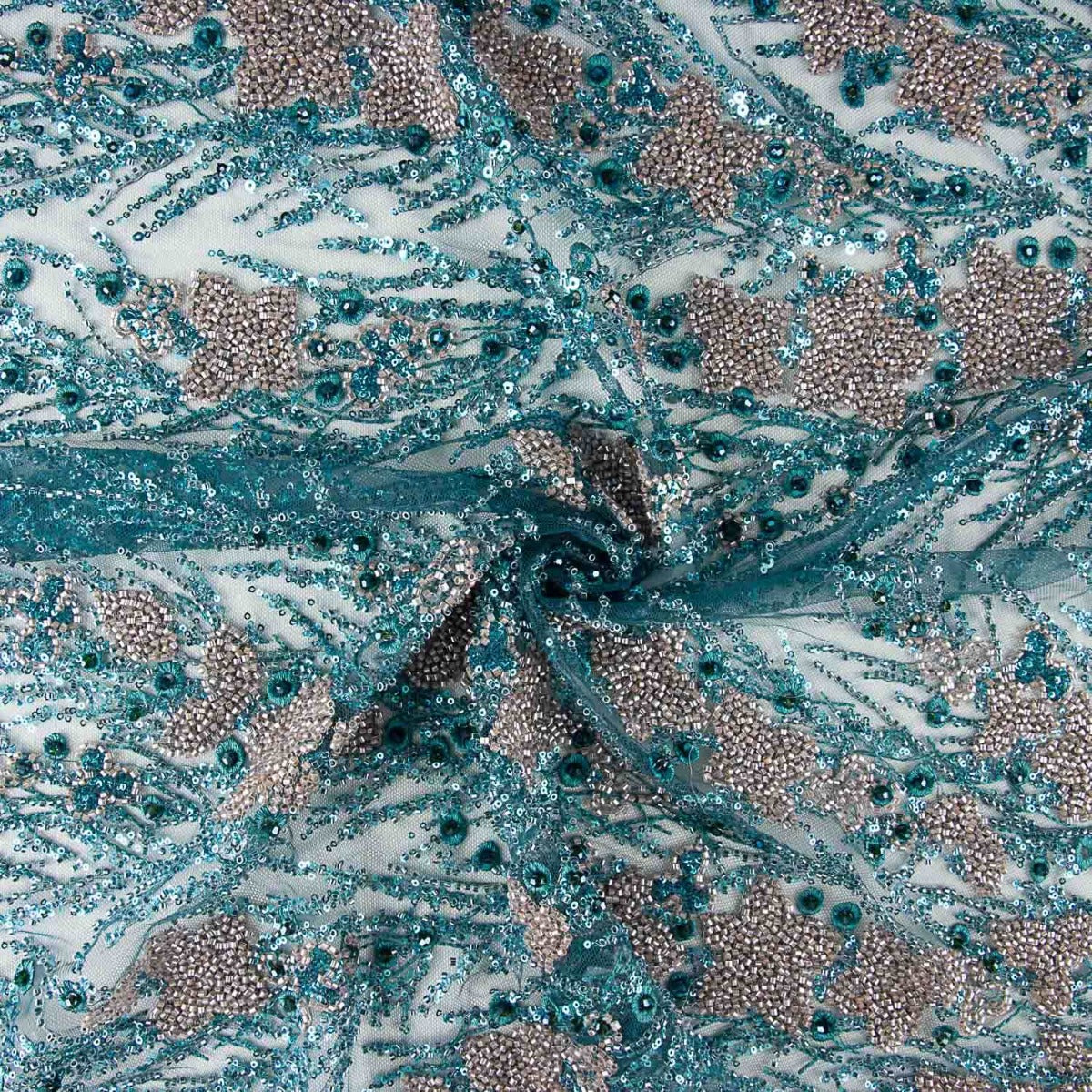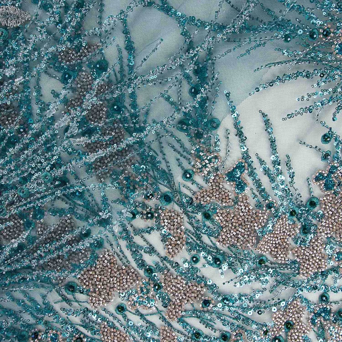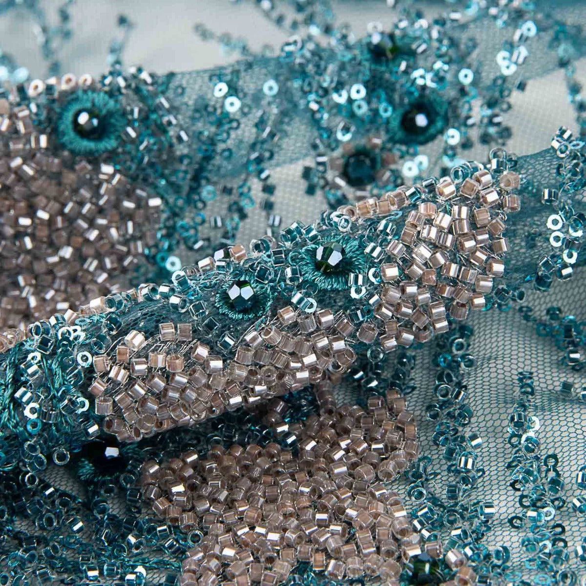 Tela pedrería bordada en tul con espacios sin bordado creando transparencias pudiendo cubrirlas con tejidos de forro a tono como: crep, satén…