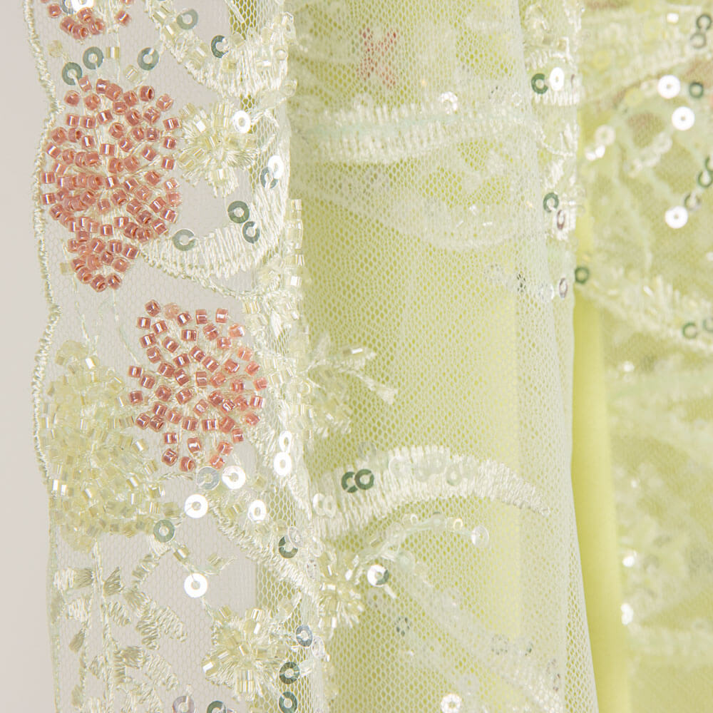 Base de tul transparente de color lima pastel bordado con cristales y lentejuelas en tonos rosa y lima claro que aportan destellos y brillos de gran contraste a la luz.