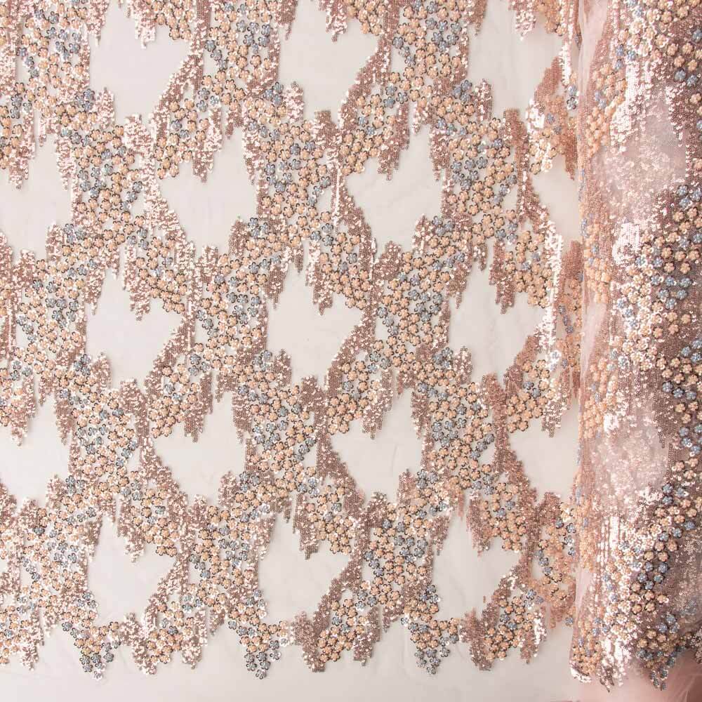 Tela de pedrería de tul color rosa claro modelo Lina con peso. Base de tul transparente de color rosa claro bordado con cristales y lentejuelas en tonos a juego que aportan destellos y brillos en tus creaciones.