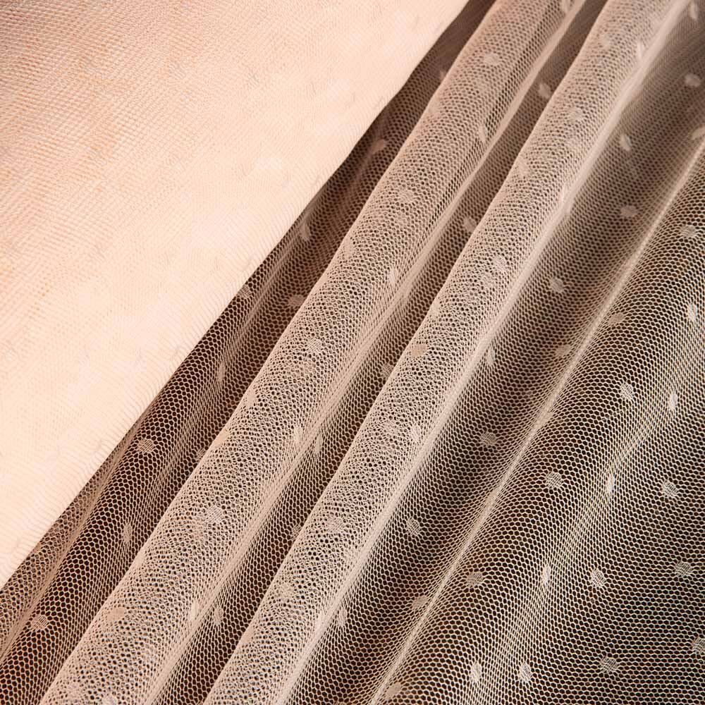 Tela de Tul mórbido con efecto plumeti en forma de lunar de unos 4 mm. en un color Rosa Salmón.