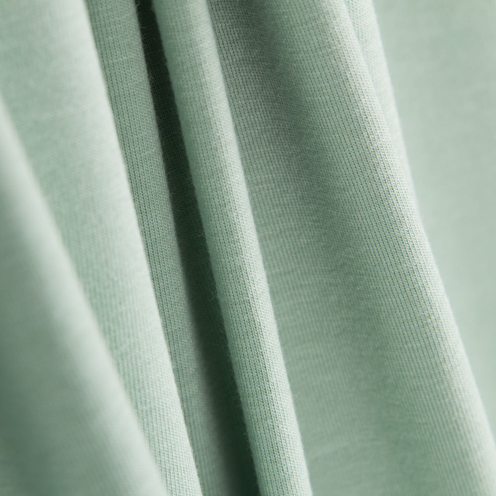 Punto elástico de algodón orgánico de color verde jade con certificado OEKO-TEX y GOTS (Global Orgánic Textile). Contiene un porcentaje de elastano que proporciona mayor comodidad y confort a las prendas.