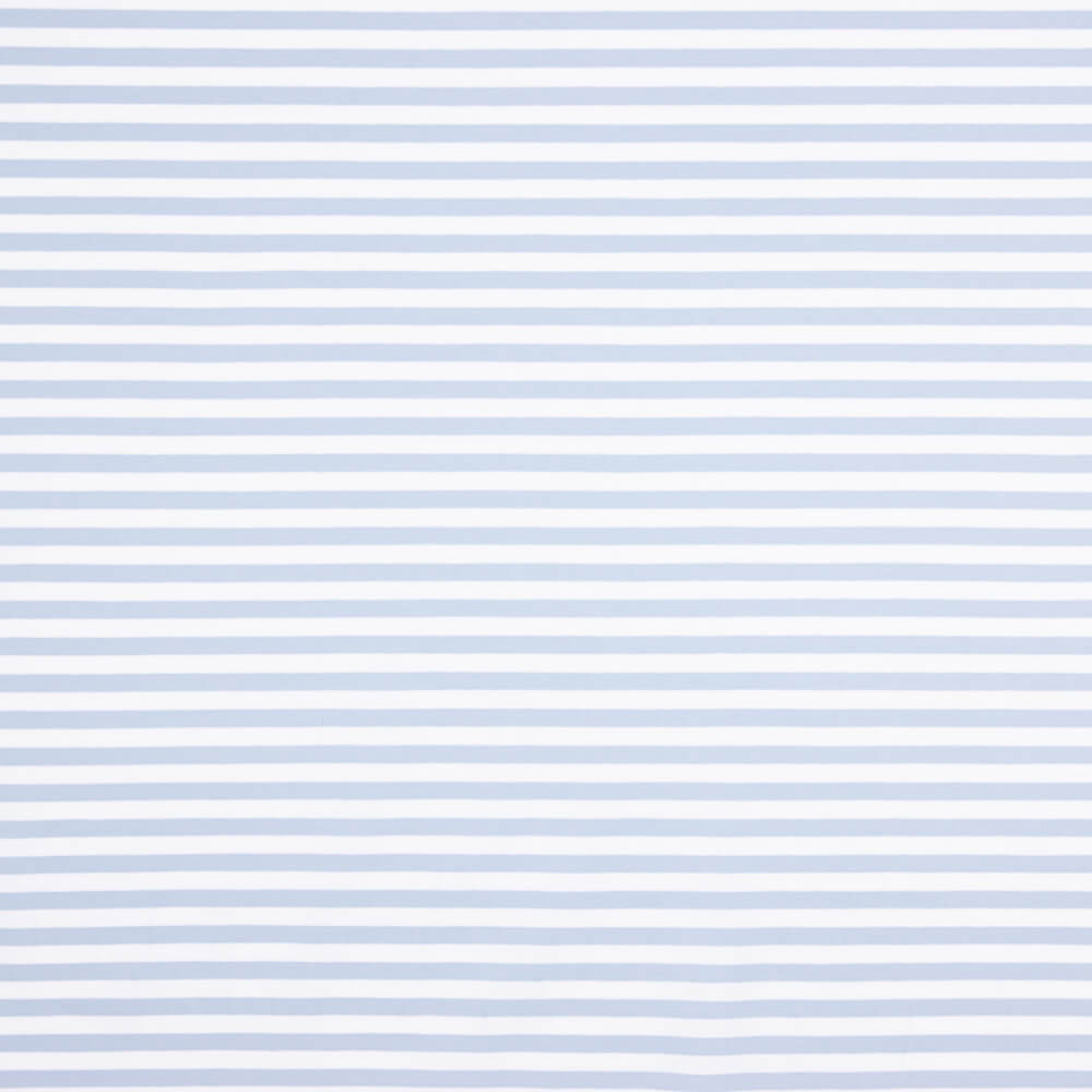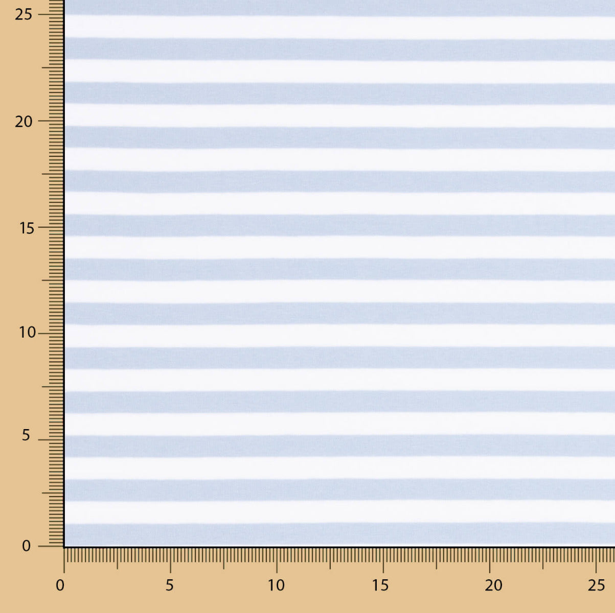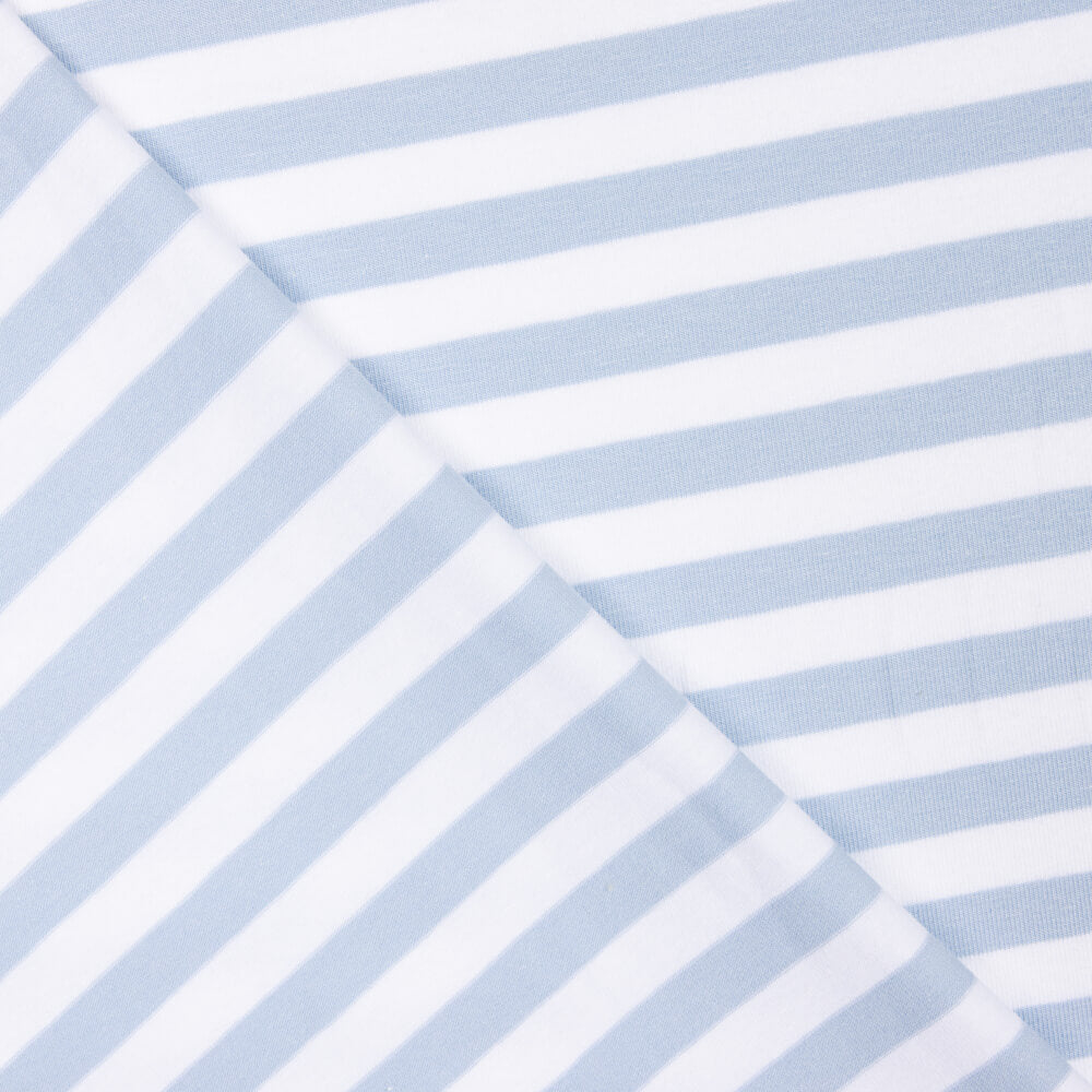 La tela de punto de estampado rayado bicolor en azul celeste y blanco, ancho de la raya de 1 centímetro y con una composición de 95% algodón y 5% elastano, ofrece una combinación ideal de confort y elasticidad.