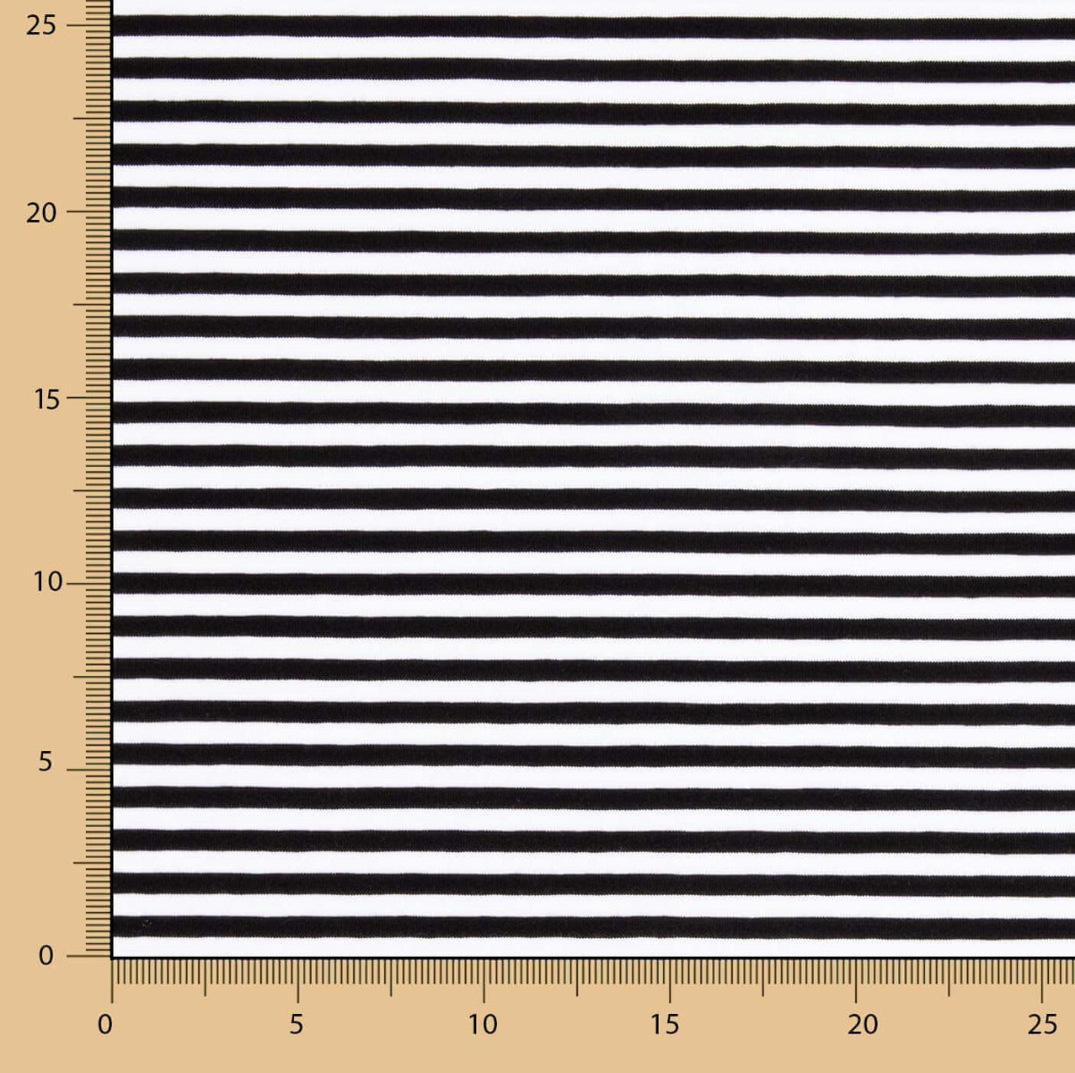 Tela de punto de estampado rayado bicolor en negro y blanco, ancho de la raya de 0,5 centímetros y con una composición de 95% algodón y 5% elastano, ofrece una combinación ideal de confort y elasticidad.