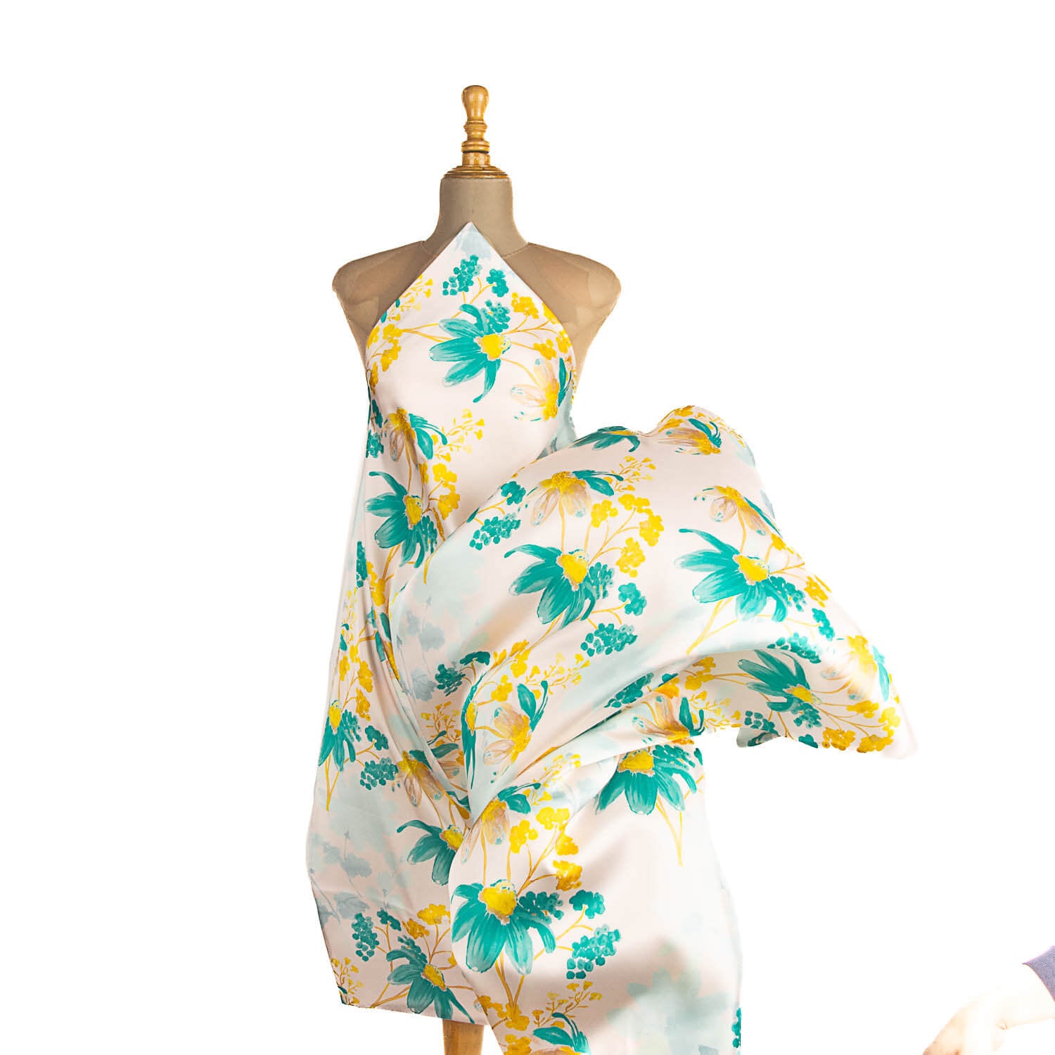 Tela de satén de tacto sedoso y con mucha caída de un estampado modelo Luna Verde Agua. La tela de satén de seda poliéster es un material lujoso y elegante que combina la suavidad y el brillo característicos del satén con la durabilidad y asequibilidad del poliéster. Esta tela se produce mediante la combinación de fibras de poliéster con un tejido satinado, lo que le confiere una textura suave y sedosa.