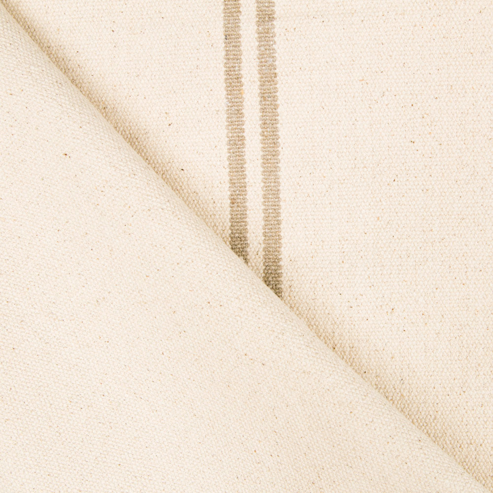Loneta gruesa de algodón con raya doble de 1 centímetro de ancho beige sobre un fondo de color crudo. Tela de lona similar al saco de grano, también conocida como saco francés, con mucho cuerpo, gran resistencia y larga durabilidad. El estampado consta de tres franjas rayadas. Una en el centro del tejido y dos franjas laterales a 35cm de distancia de los orillos.