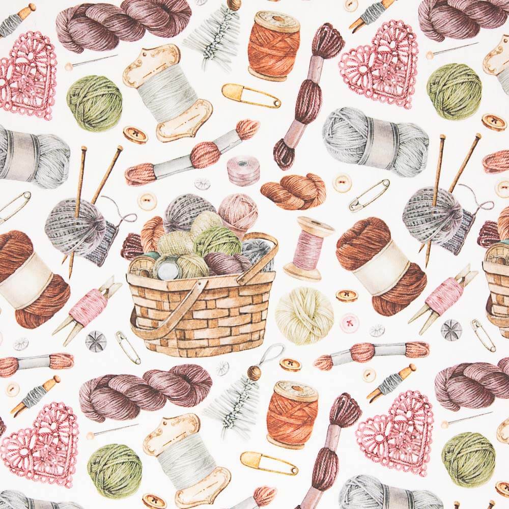 La tela de loneta de estampado digital en colores vivos con dibujos de utensilios de tricotar sobre base en color crudo, es una opción resistente y versátil que ofrece una amplia variedad de diseños impresos sobre una base de loneta.