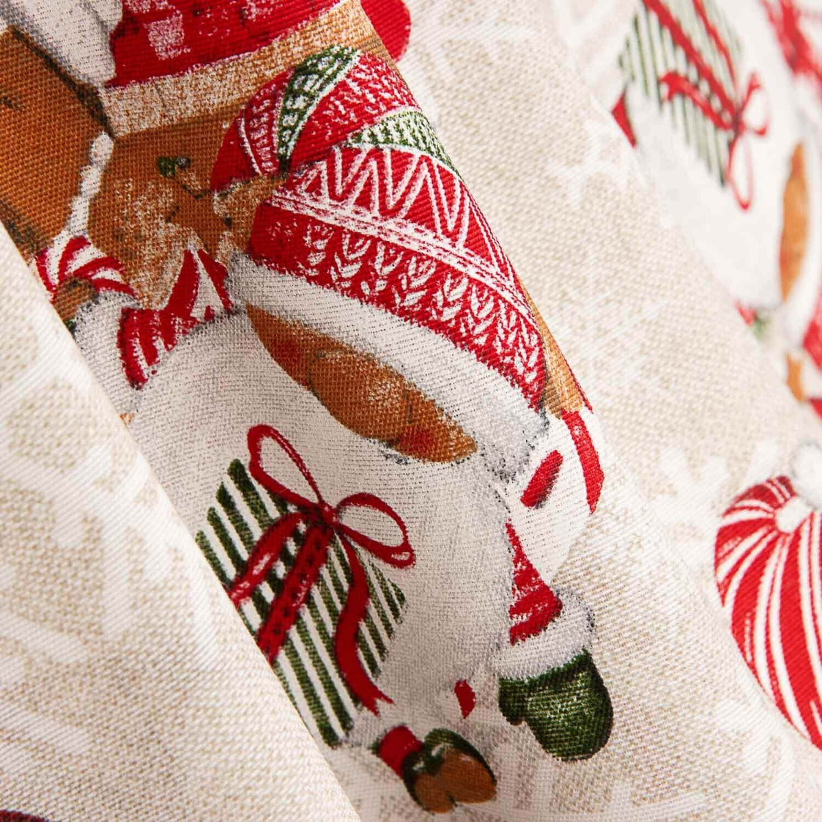 Tela de Loneta con estampado navideño de personajes de gnomos , regalos, estrella polar sobre un tono crudo jaspeado, ideal para darle un toque festivo a tu hogar.