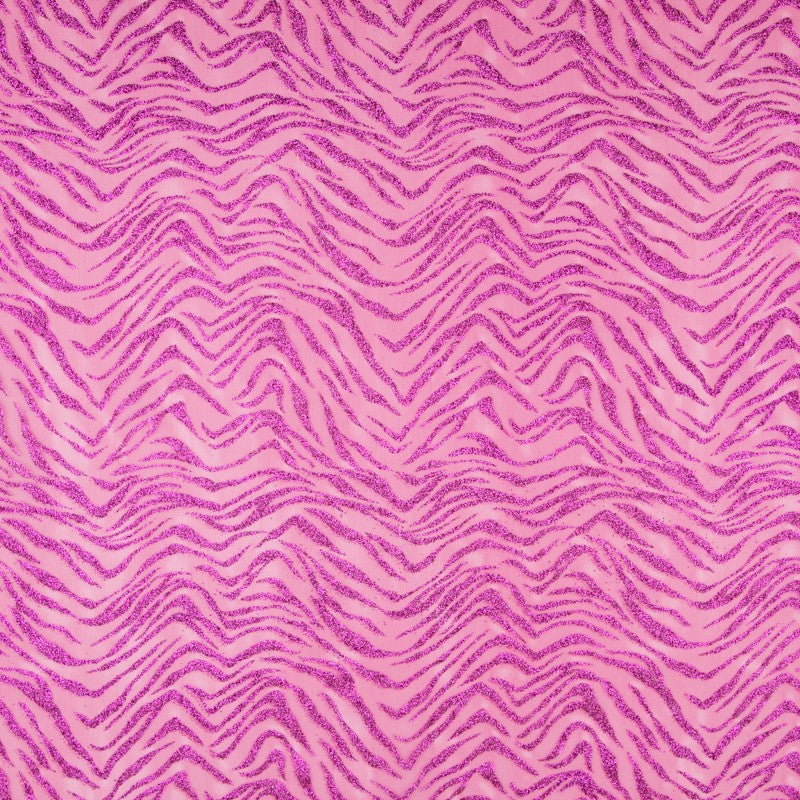 Tela con purpurina morada sobre una base de tul elástico fucsia. El tul es una tela calada y elástica que se caracterizada por la creación de transparencias. Tela brillante con purpurina totalmente fijada al tul, ideal para confeccionar vestidos para espectáculos, maillots, disfraces y prendas que requieran un total ajuste al cuerpo con transparencias.