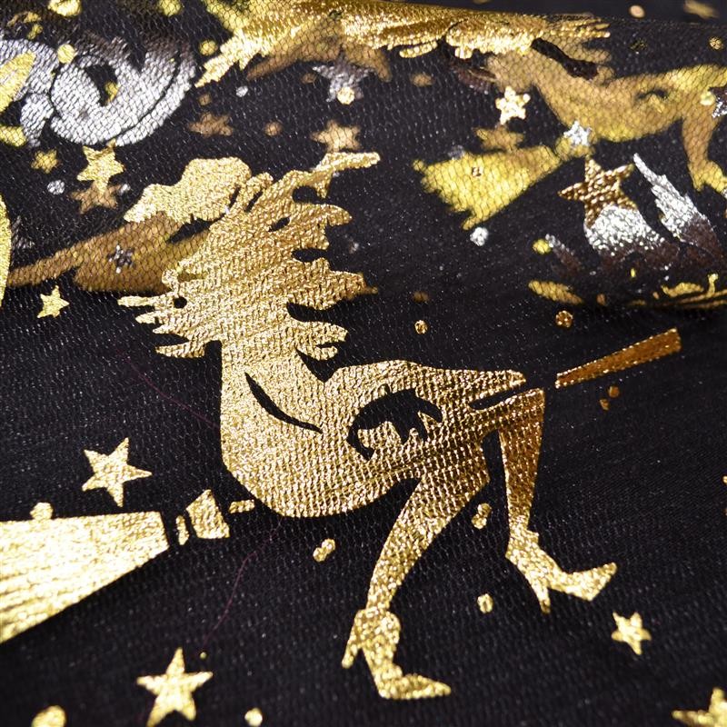 Organza estampada con motivos de halloween dorados con purpurina sobre una base translúcida de color negra. Tela para disfraces de carnaval brillante, fina y muy suave con lunares multicolor.