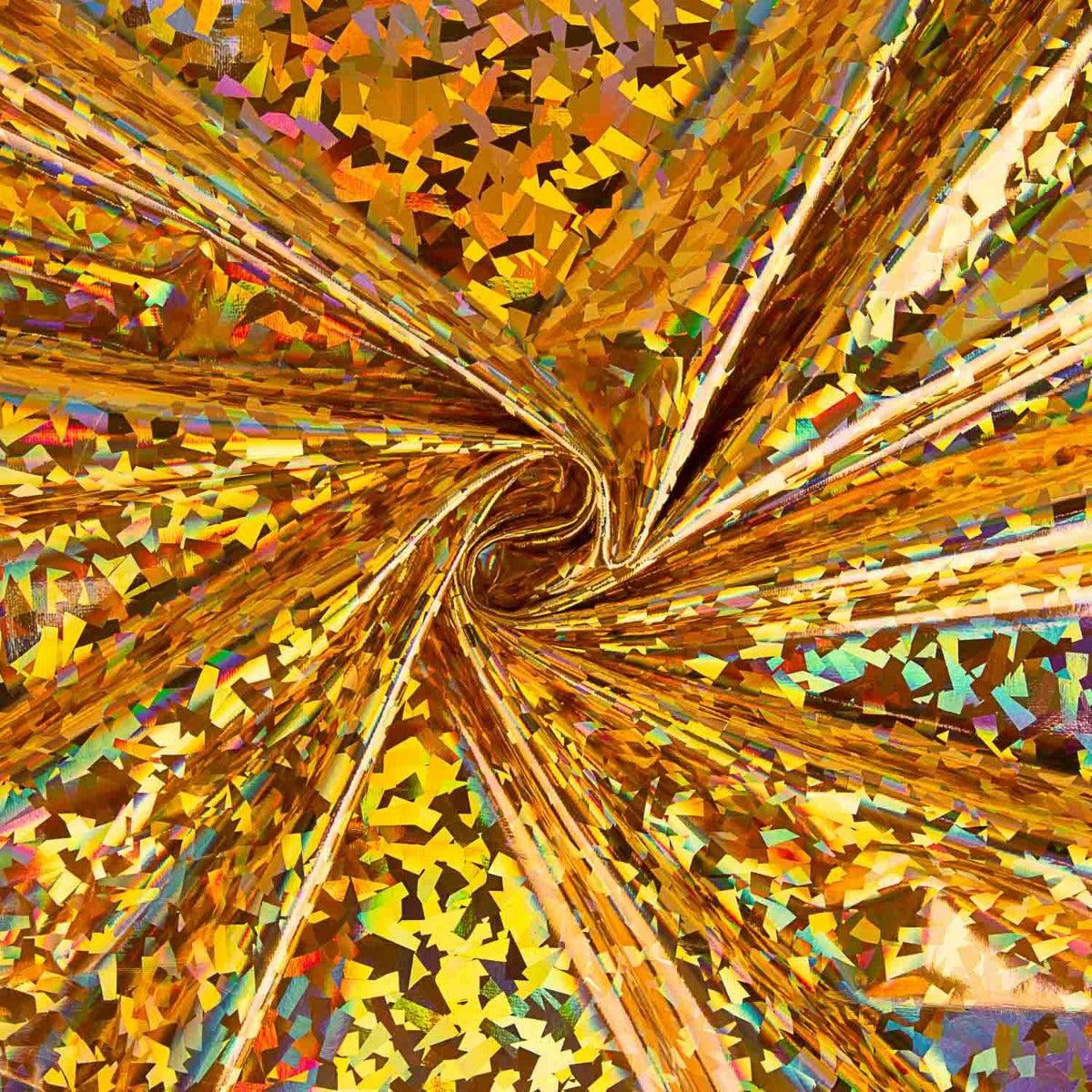Su diseño en triángulos dorados con efecto holográfico produce destellos vibrantes al moverse, creando un efecto visual cautivador.