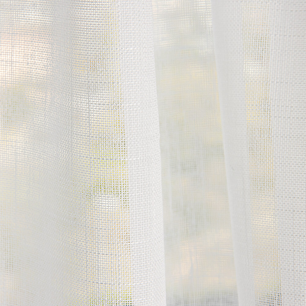 Visillo Rústico blanco natural ignífugo. Tela visillo etamin con bajo acabado en cinta de plomo de color crudo. Tela de poliéster 100% en un práctico ancho de 280cm.