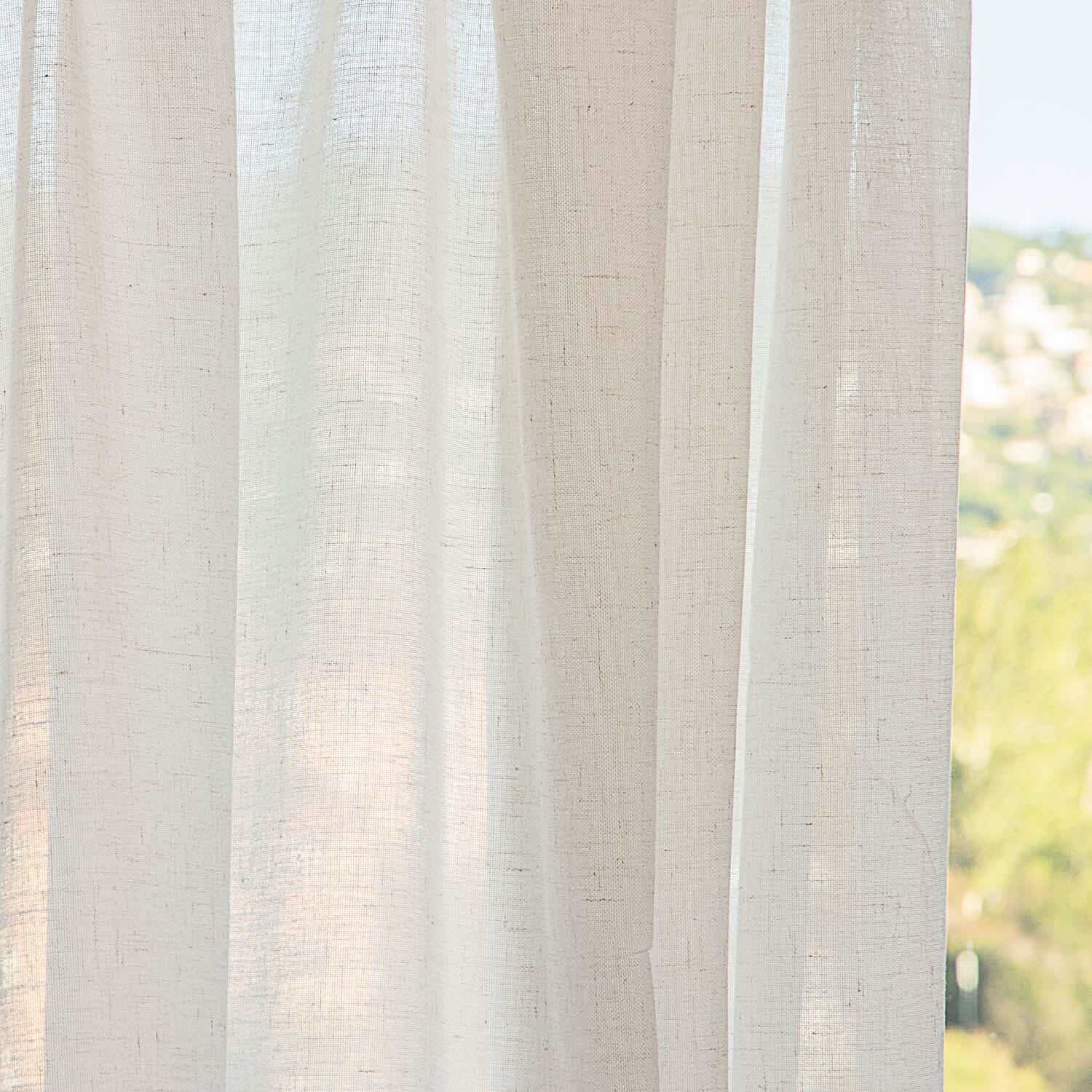 Visilo de poliéster tupido imitando a lino en color lino. Tela de visillo con trama cerrada y cierta opacidad, permite la entrada de luz sin ver el interior de la vivienda a primera vista. Se adapta a cualquier tipo de confección como onda perfecta, tablas, cinta de ojal... con buena caída debido al bajo de plomillo. Tela con bajo de plomillo y altura especial de 320cm.
