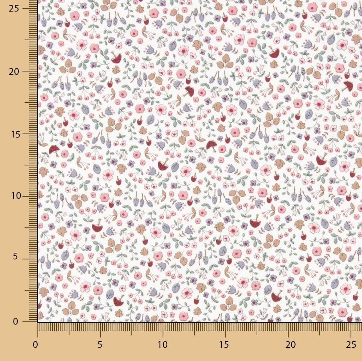Su delicado estampado floral tipo liberty en tonos malva, rosa empolvado, azul claro y beige sobre fondo natural la convierte en una opción ideal para confeccionar camisas, blusas, vestidos, faldas, ropa infantil, pijamas o complementos textiles.