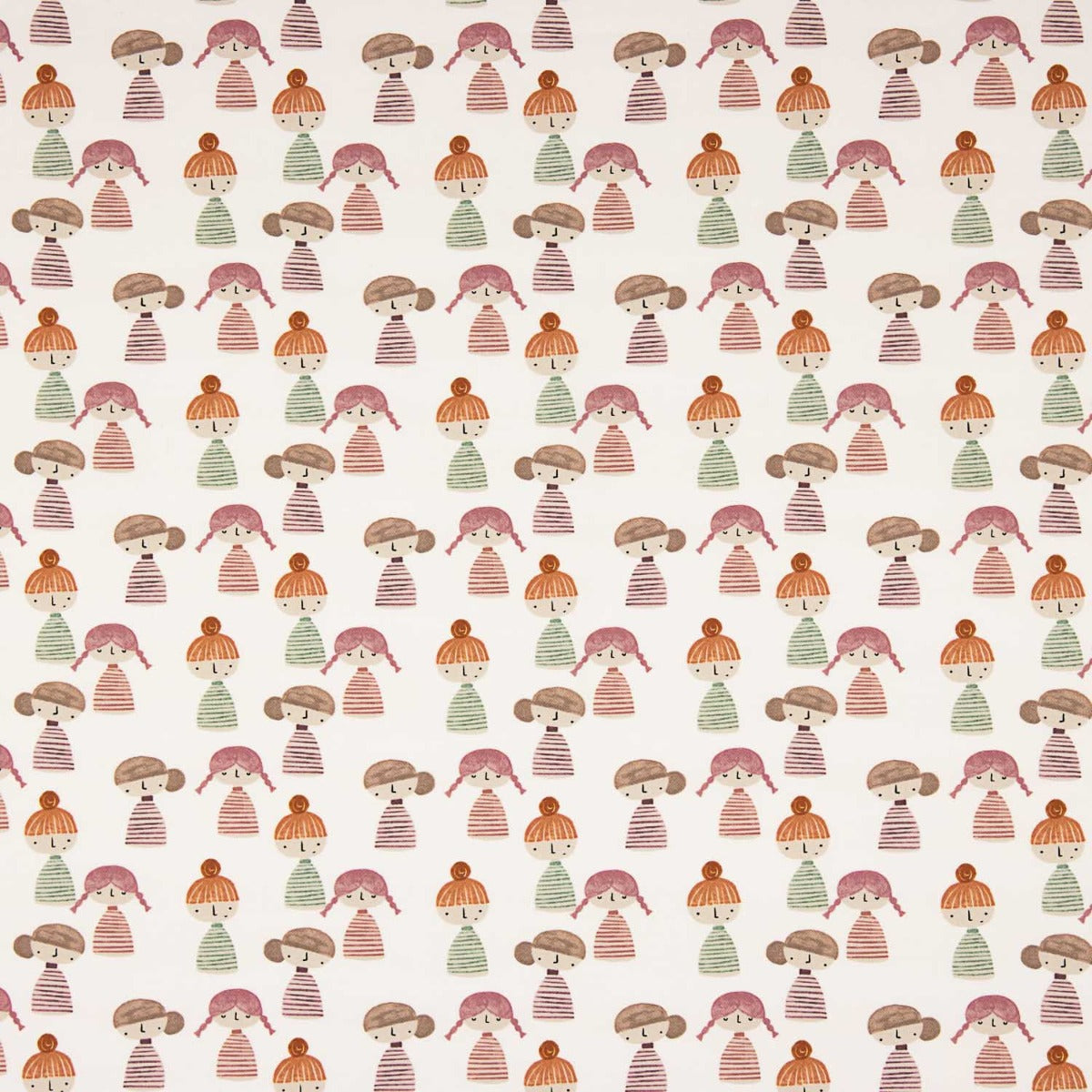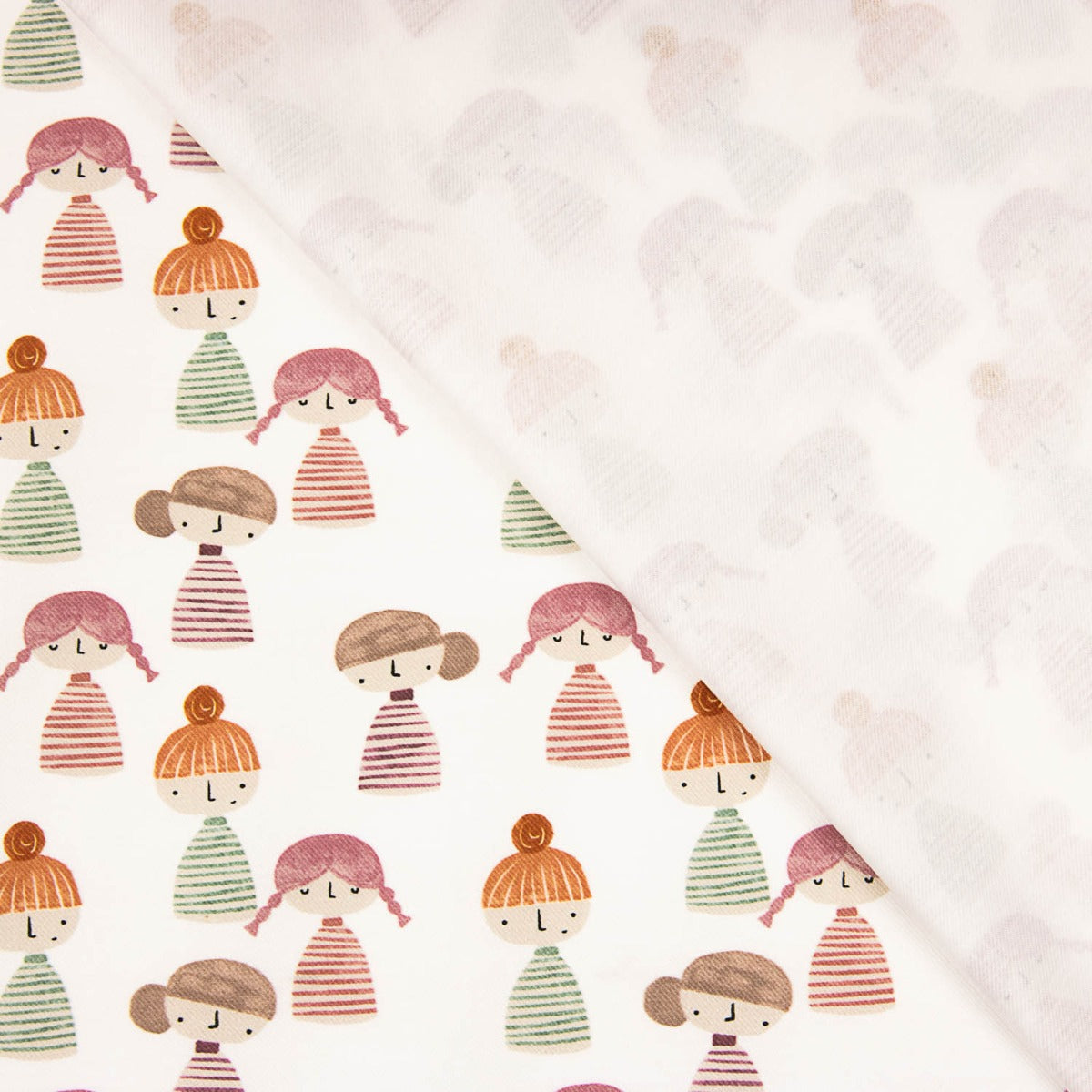 Tela de viyela de algodón estampada infantil de siluetas de niñas con pelo de tonos naranjas y marrón sobre fondo blanco, tela suave, ligera y perfecta para confecciones delicadas.