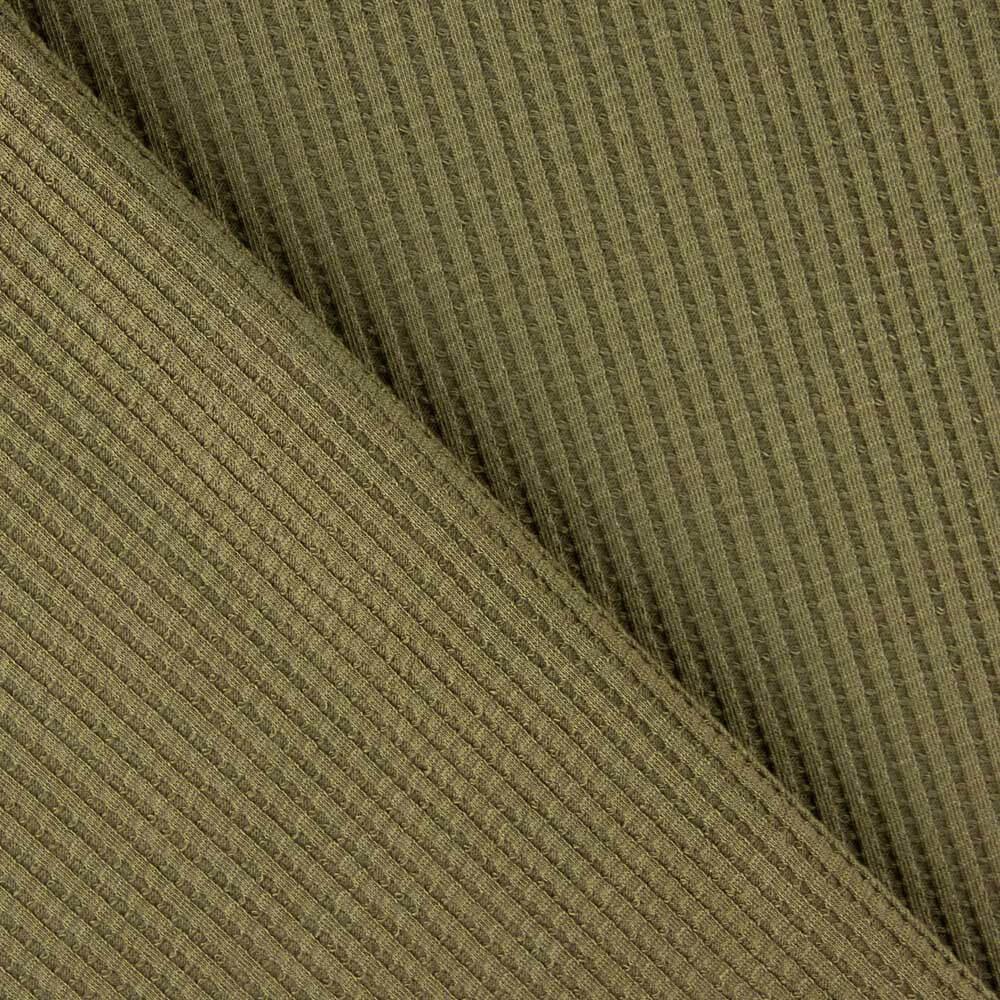 Tela punto waffle en color verde caza. Tela de aspecto y textura igual que el waffle pero en tela de punto y elástico.