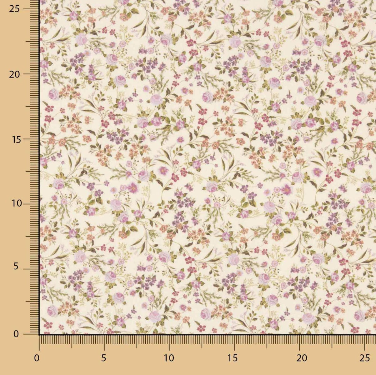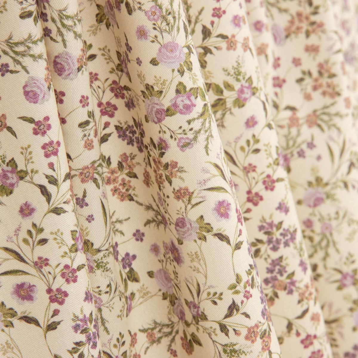 Inspirada en la belleza de las flores silvestres, esta tela de batista de algodón estampada presenta un diseño floral delicado en tonos lavanda, rosa y verde oliva sobre fondo crudo, ideal para confecciones con encanto natural.