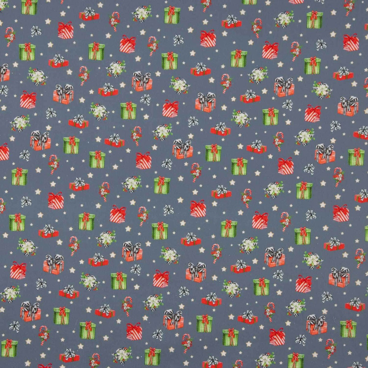 Tela de popelín en algodón 100% con un estampado navideño repleto de cajas de regalo, lazos, bastones de caramelo y pequeñas estrellas sobre un elegante fondo azul grisáceo.
