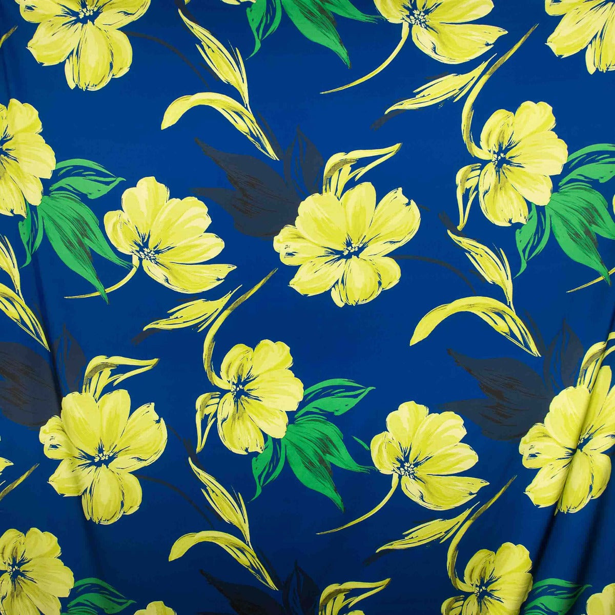 Tela de satén de tacto sedoso y con mucha caída de un estampado maxi floral en amarillo con base de fondo en color azul royal.