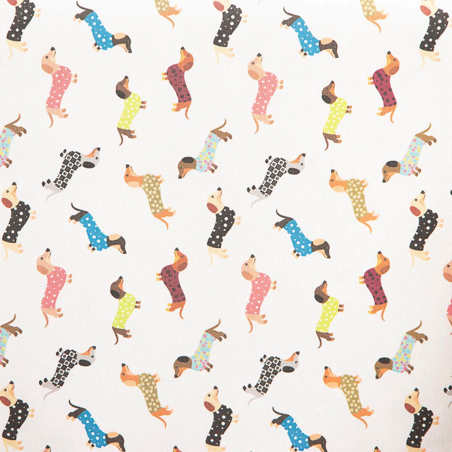 Composición: 70% algodón – 30% poliéster | Acabado: Resinado y teflonado antimanchas | Ancho: 140 cm | Diseño: Perritos teckel multicolor | Uso: Mantelería y decoración