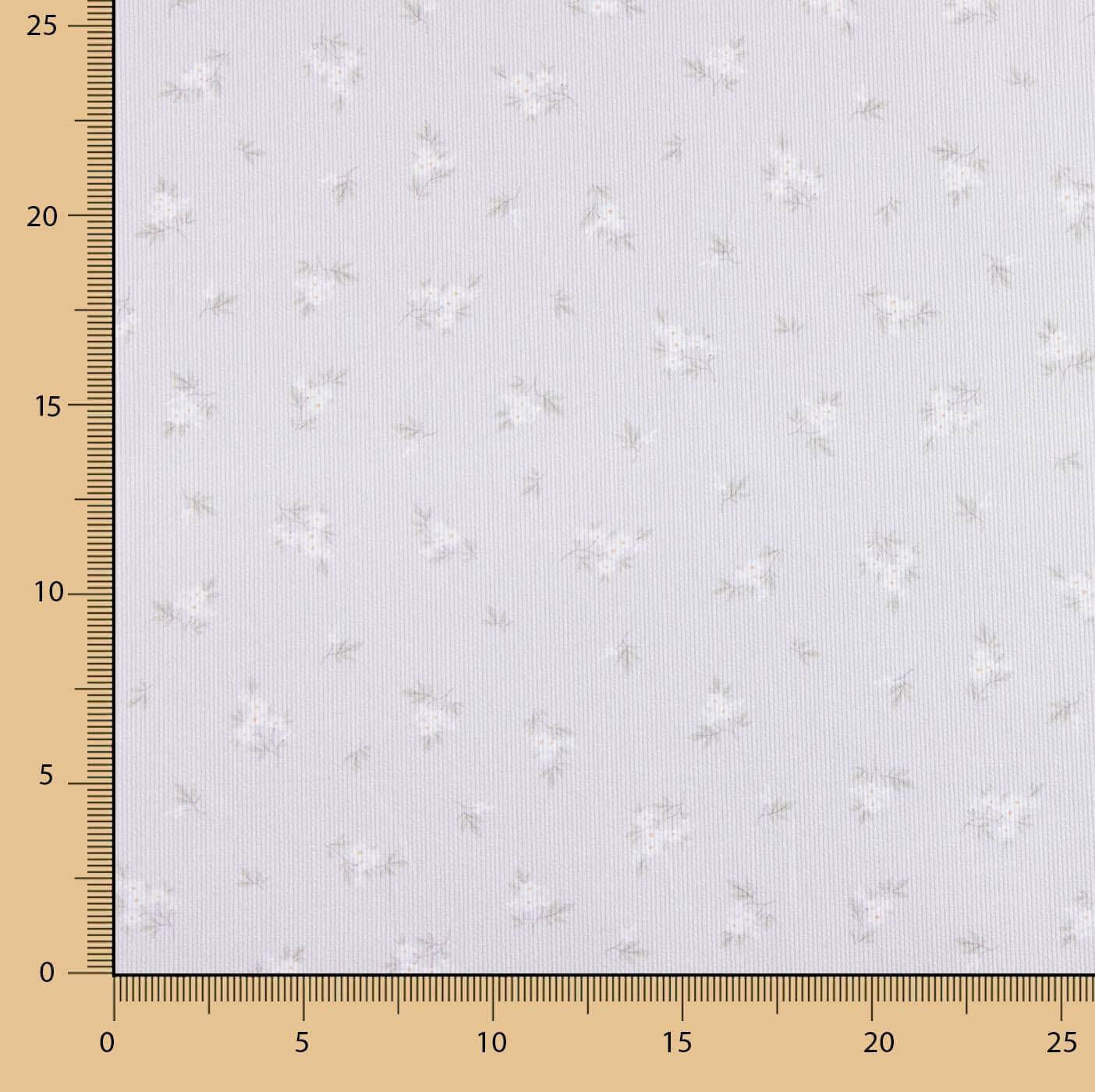 Tela de piqué 100% algodón con delicado estampado de mini ramitas en tono gris sobre fondo blanco.