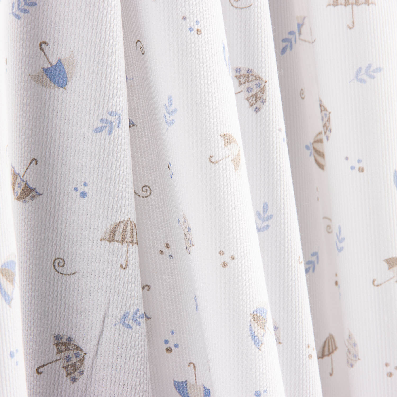 Tela de piqué 100% algodón con estampado de pequeños paraguas en tonos azul y beige sobre fondo blanco.