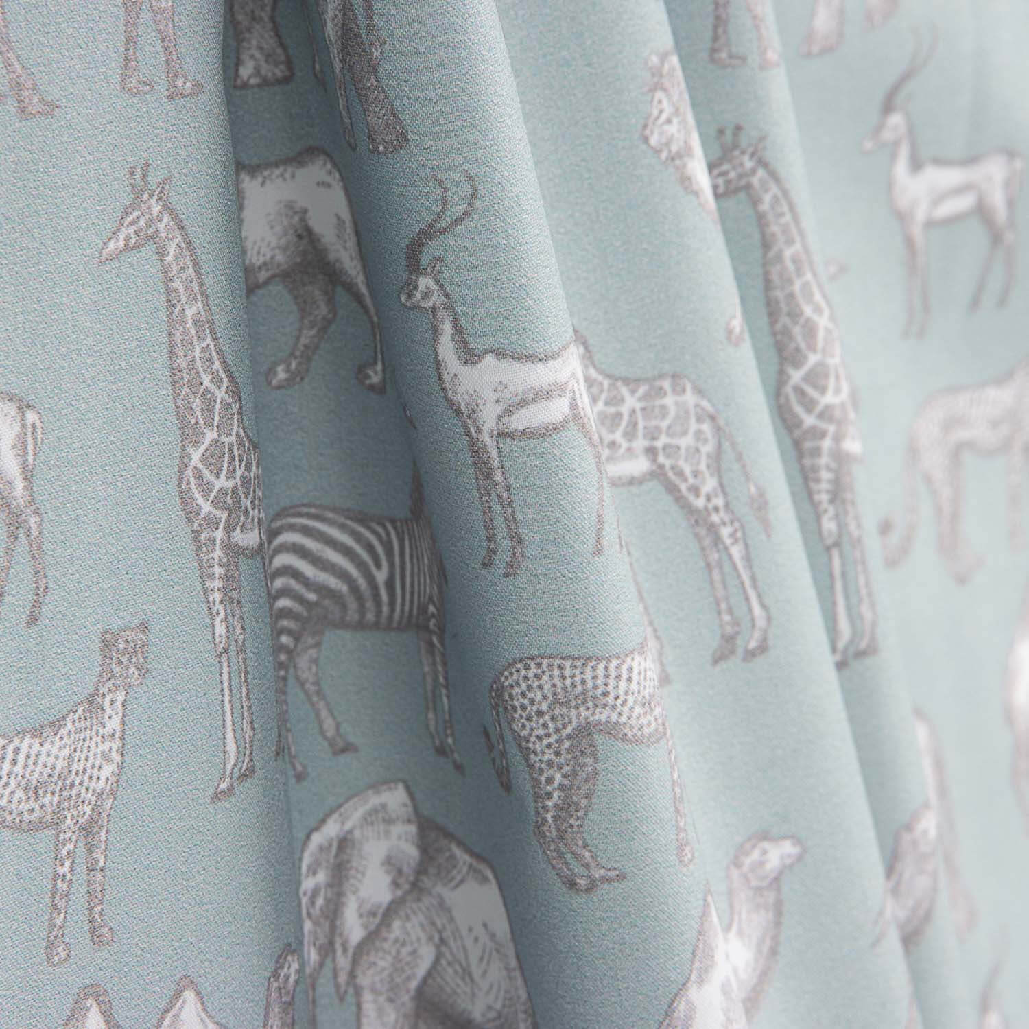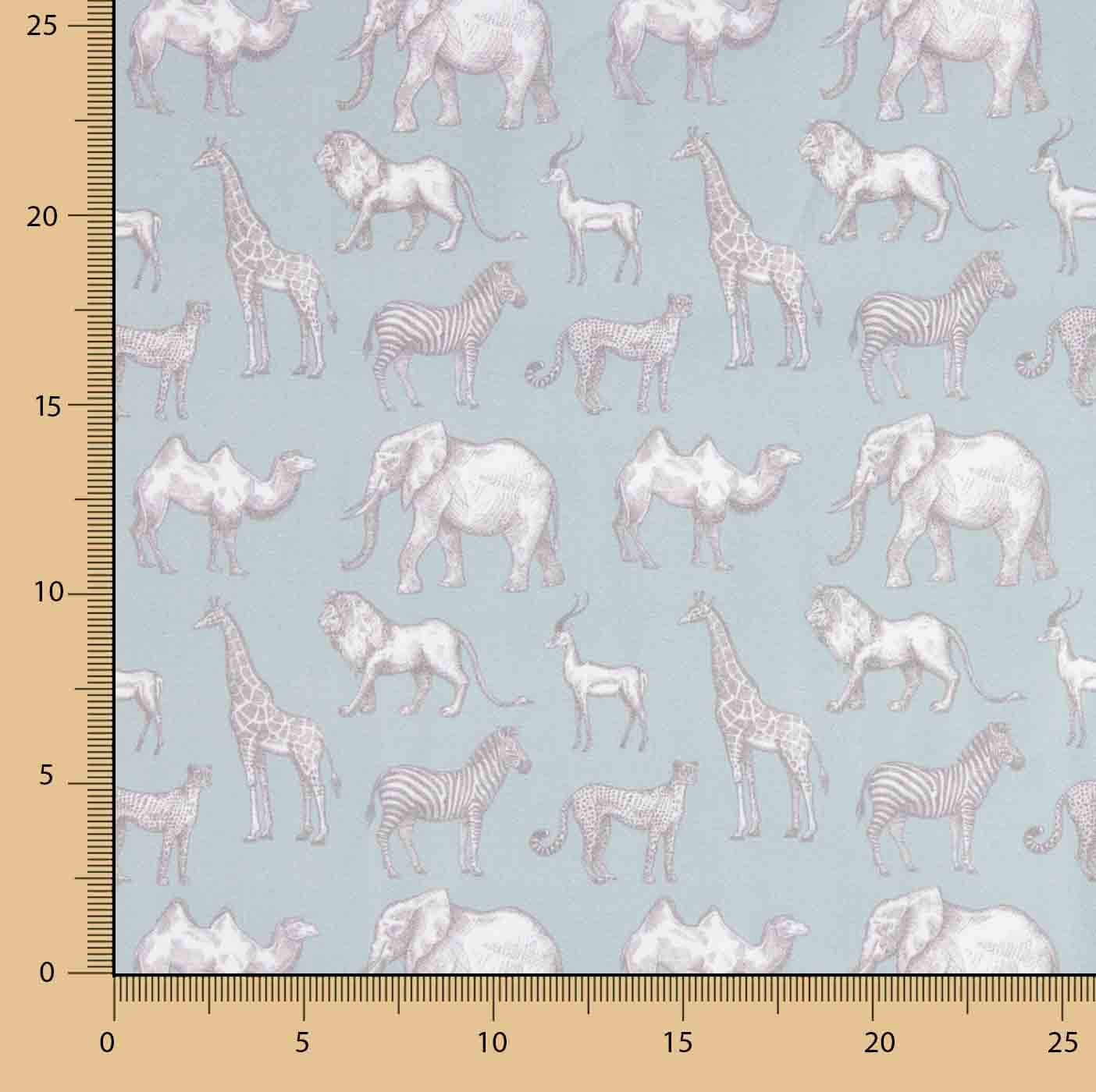 Composición: 100% algodón | Calidad: Percal 200 hilos | Ancho: 140 cm | Estampación: Digital de alta definición | Diseño: Animales safari sobre fondo verde agua | Usos: Ropa infantil, sábanas, fundas nórdicas, cortinas, cojines y decoración temática