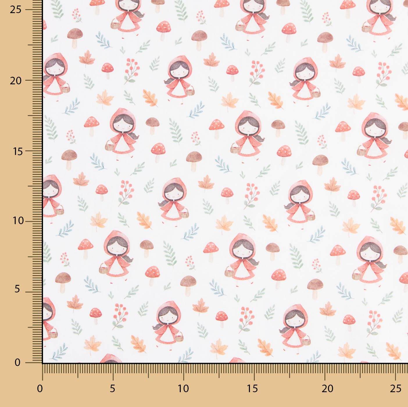 Percal Estampado Caperucita confeccionado en algodón 100% y tejido en percal de 200 hilos, que ofrece suavidad, frescura y excelente resistencia. Presenta un encantador estampado digital inspirado en el cuento de Caperucita Roja, con pequeñas ilustraciones infantiles acompañadas de setas y hojas en tonos suaves sobre fondo claro, creando un diseño dulce y delicado ideal para confección infantil y decoración.