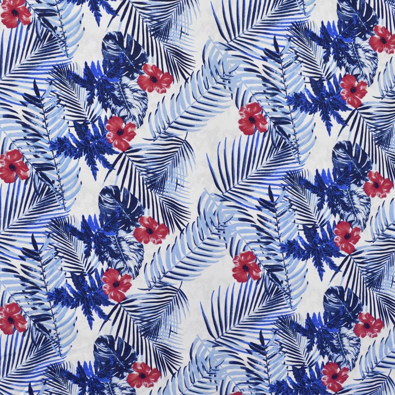 Tela de crepe con estampado con hojas de palmeras en tonalidades azules sobre un fondo blanco sobre un fondo verde. Crepe opaca, con mucho vuelo y caida, textura rugosa al tacto que recuerda al Crespón y al Koshibo pero de una calidad superior. Tela ideal para la confección de trajes de flamenca, blusas, vestidos y faldas.