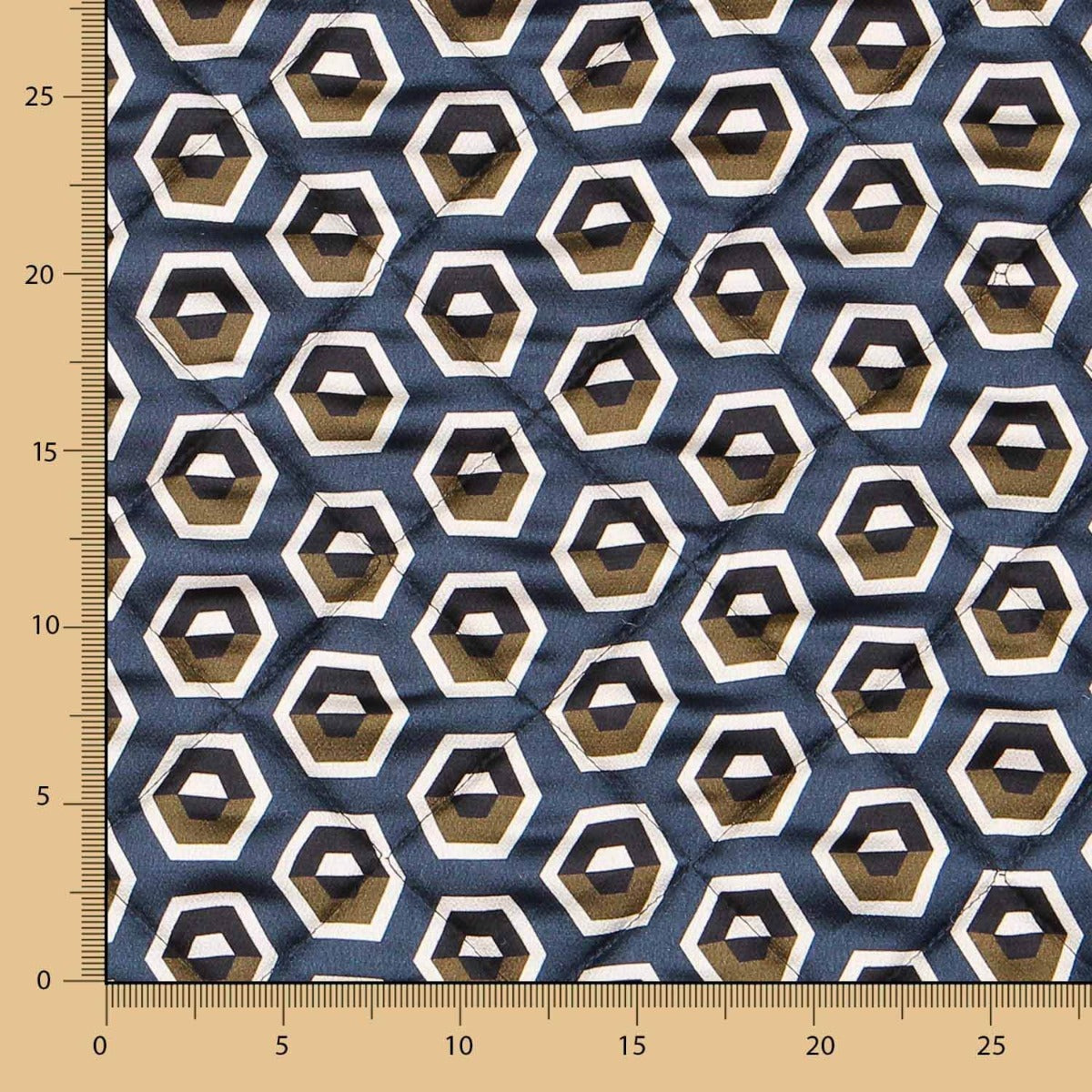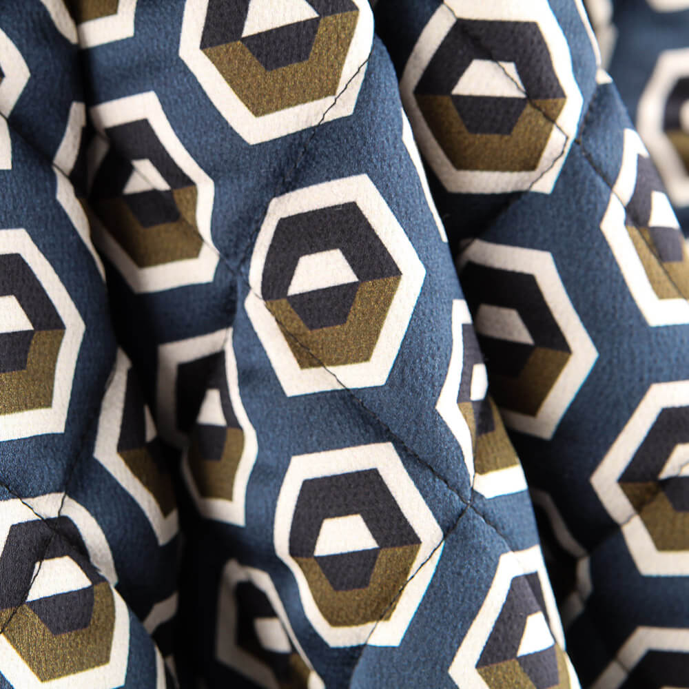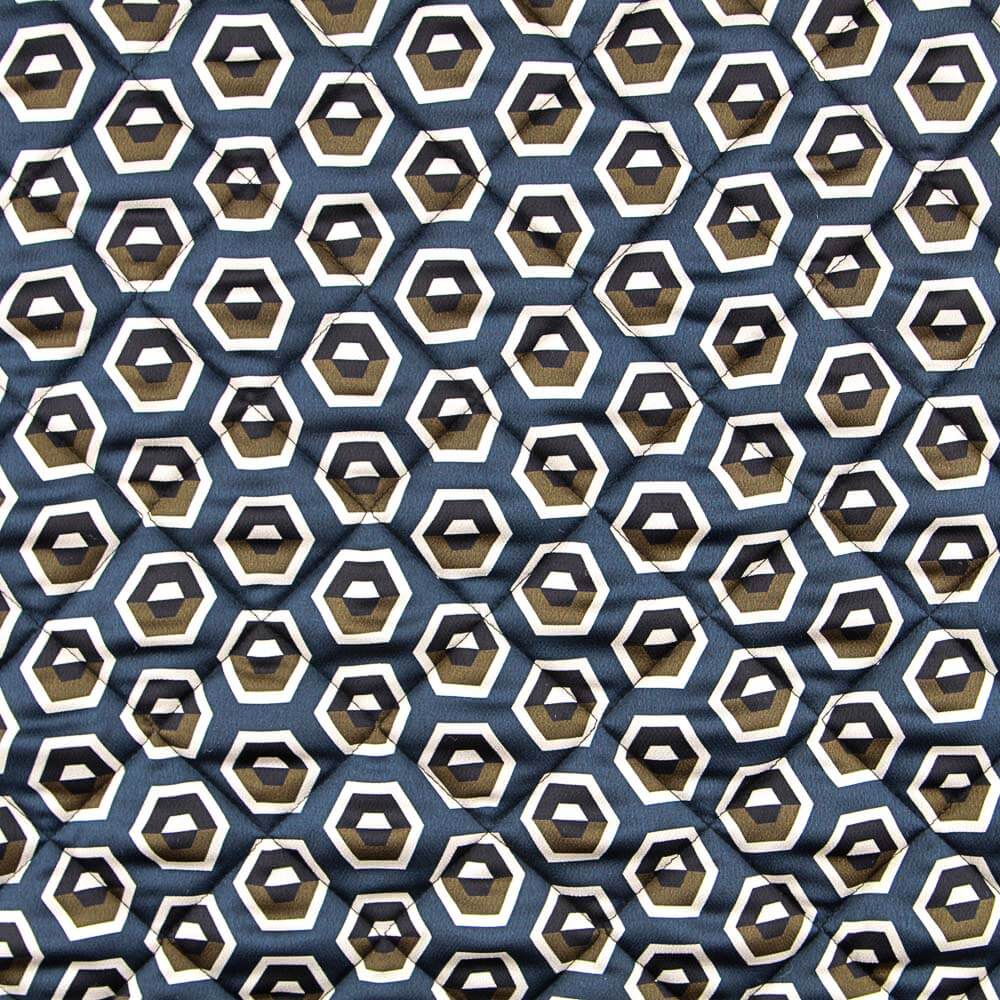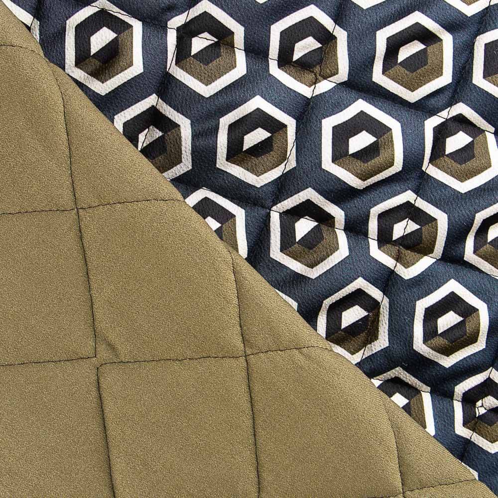 Tela acolchada de color verde caza con interior estampado geométrico verde. Tela con relleno acrílico y volumen para complementos infantiles. Tela acolchada de algodón de dos caras.