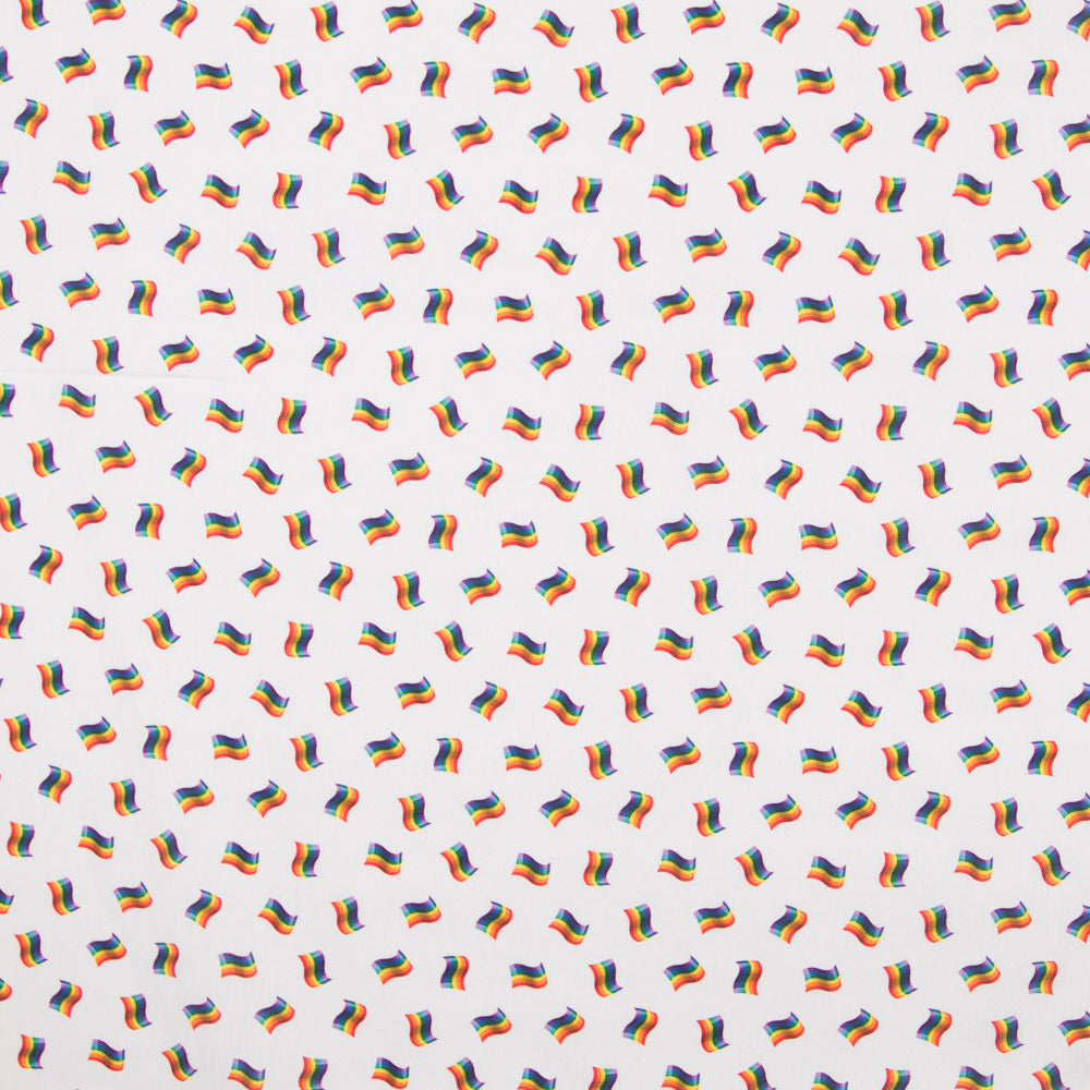 Popelín de banderas del orgullo LGTBI sobre fondo blanco de algodón transpirable, fino y muy suave. El popelín es una tela básica ideal para confeccionar cojines, sábanas, patchwork y todo tipo de decoraciones. Al ser un tejido 100% algodón, es preferible un lavado previo antes de manipular.