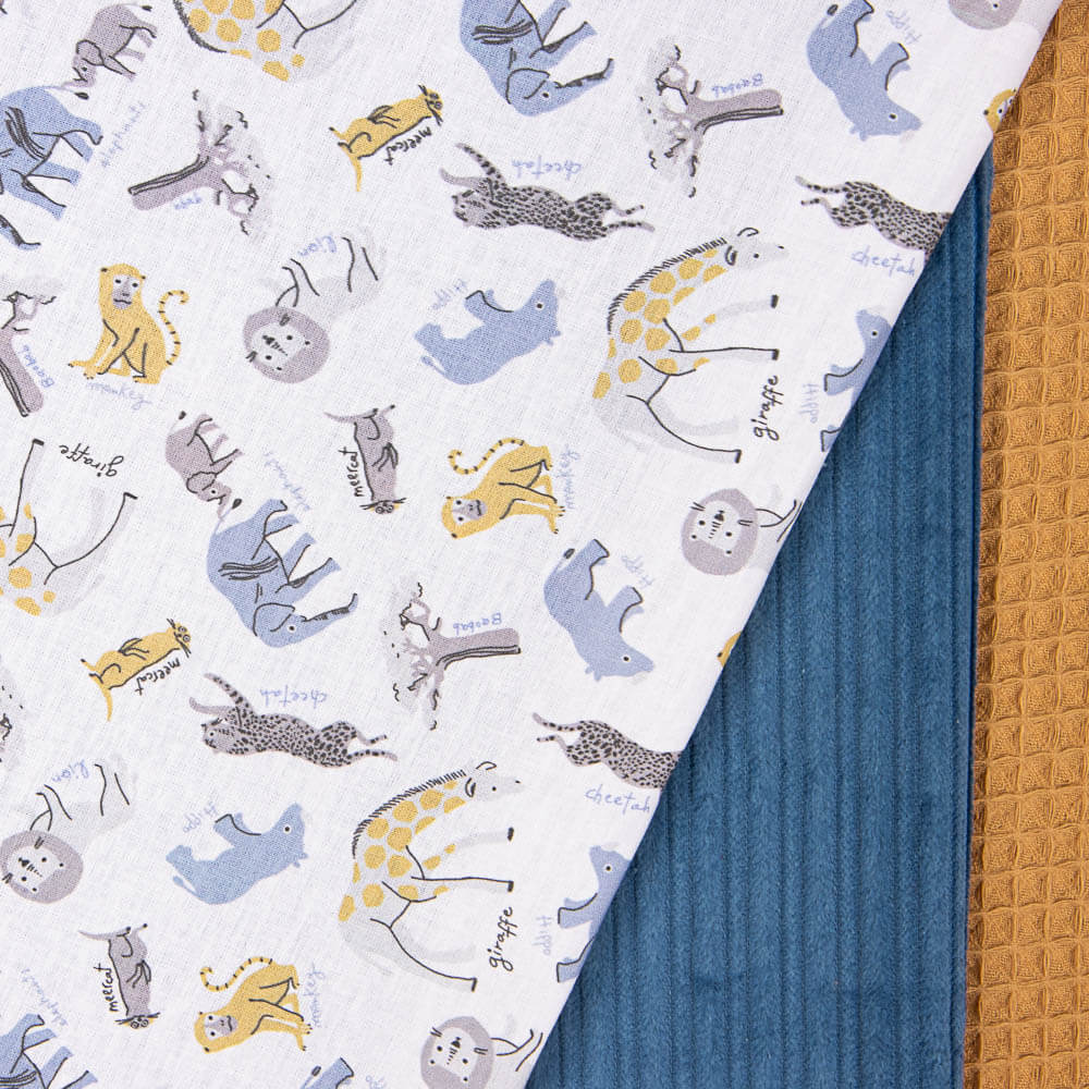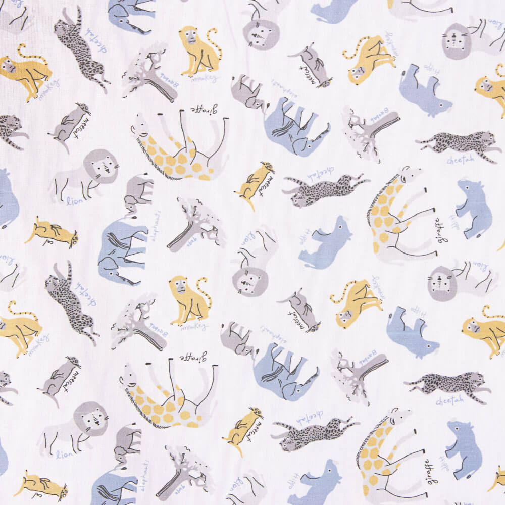 Tela de Algodón estampado de dibujos de varios animales sobre base en color blanco.