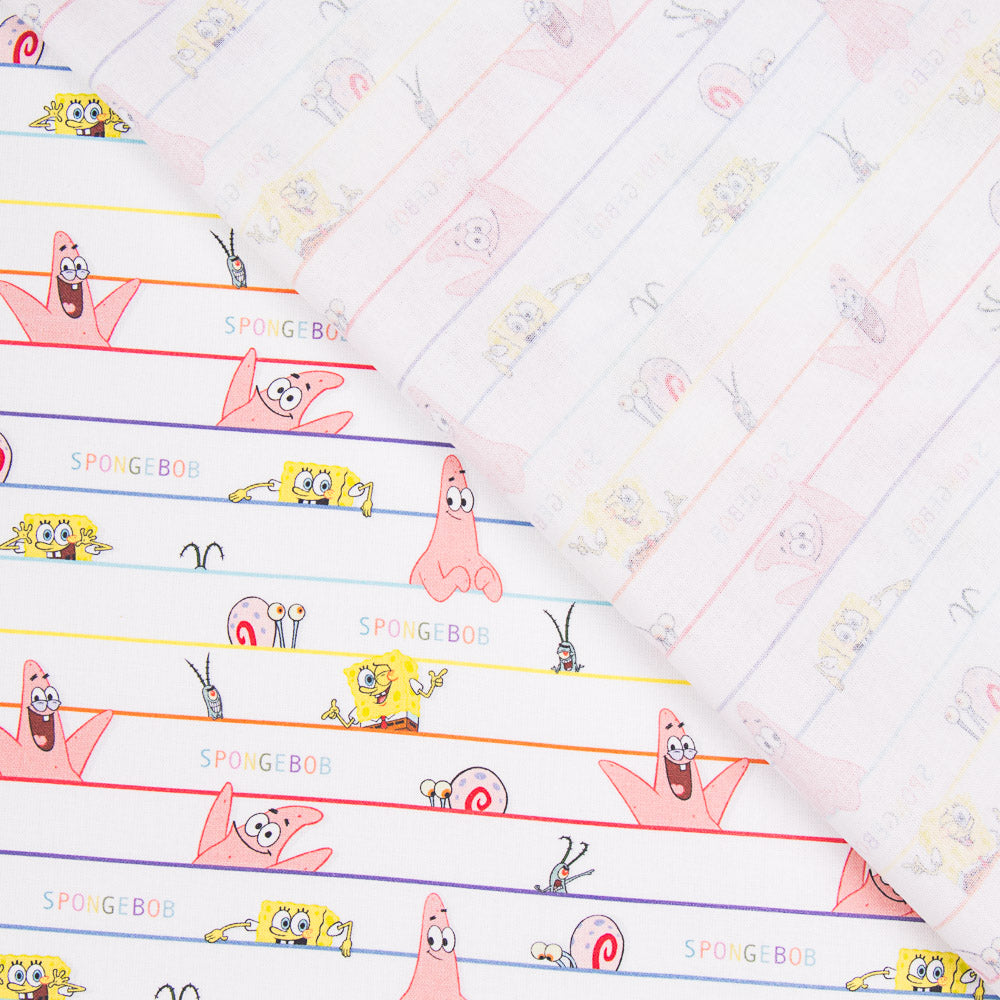 Tela estampada de algodón Bob Esponja Rayas Rosa muy original. Popelín de algodón transpirable, fino y muy suave, caracterizada por su gran versatilidad. El popelín es una tela básica ideal para confeccionar cojines, sábanas, patchwork y todo tipo de decoraciones. Al ser un tejido 100% algodón, es preferible un lavado previo antes de manipular.