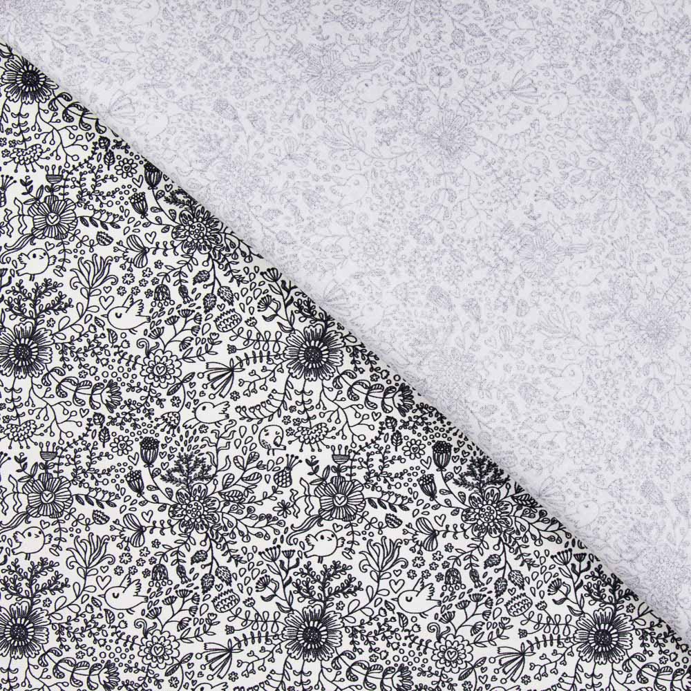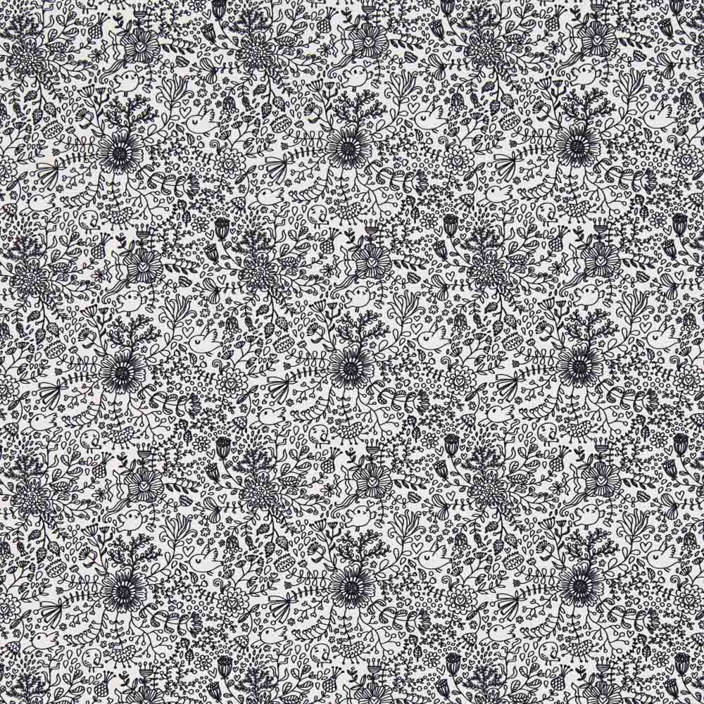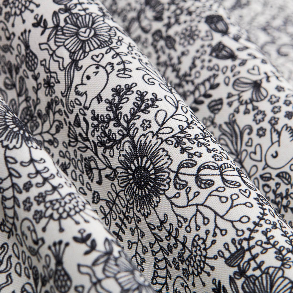 Algodón estampado tipo percal con estampado bosque mágico negro. Tela de algodón orgánico certificado por ICEA de gran calidad, sostenida y suave. Popelín ideal para confección de sábanas, cojines, cortinas y accesorios como neceseres, fundas y bolsas. También es perfecta para creaciones de patchwork y labores.