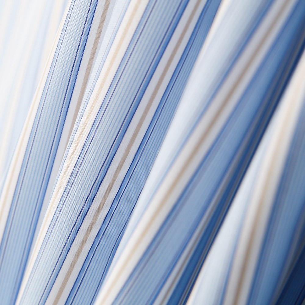 Tela para camisería italiana de rayas azules y beige. Tela de algodón para camisas de rayas fluidas y finas de gran calidad.