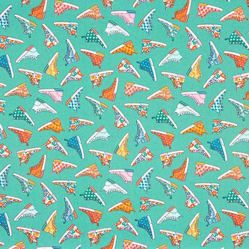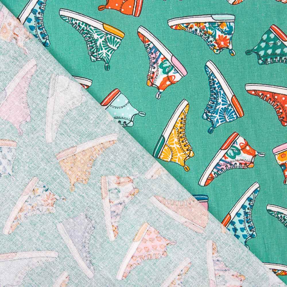 Tela de popelín en algodón con estampado de zapatillas de estilo Basket multicolor sobre fondo tono verde.