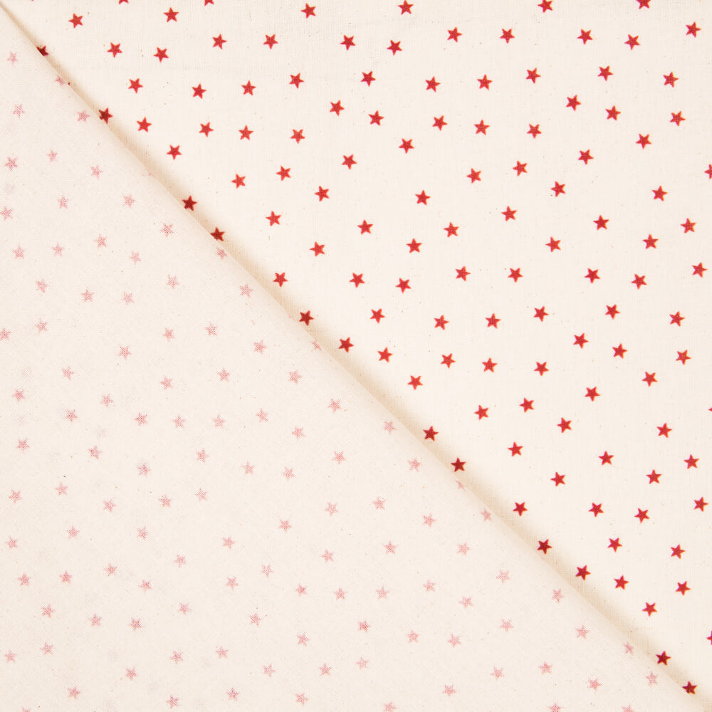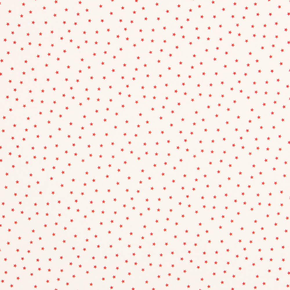 Algodón estampado tipo percal con estampado estrellas rojas. Tela de algodón orgánico certificado por ICEA de gran calidad, sostenida y suave. Popelín ideal para confección de sábanas, cojines, cortinas y accesorios como neceseres, fundas y bolsas. También es perfecta para creaciones de patchwork y labores.
