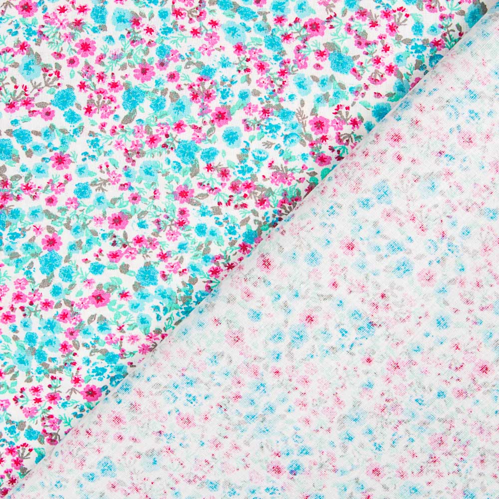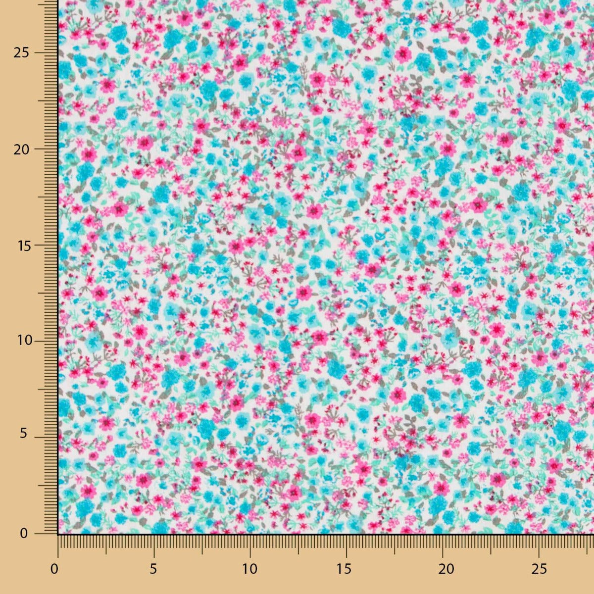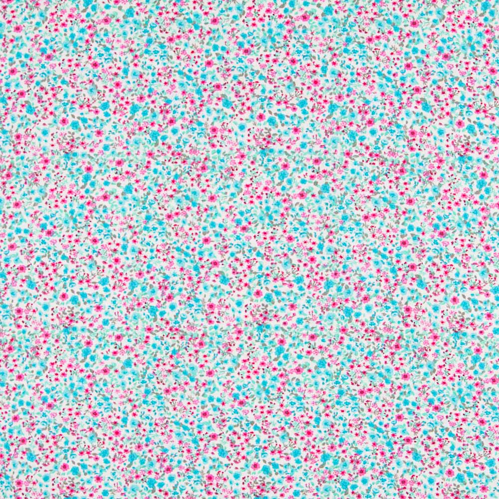Tela de algodón de flores pequeñas fucsias y azules. El popelín de algodón es una tela sostenida, fina, muy suave y muy versátil. El popelín es una tela básica ideal para confeccionar cojines, sábanas, patchwork y todo tipo de decoraciones. Telas con certificado OEKO-TEX