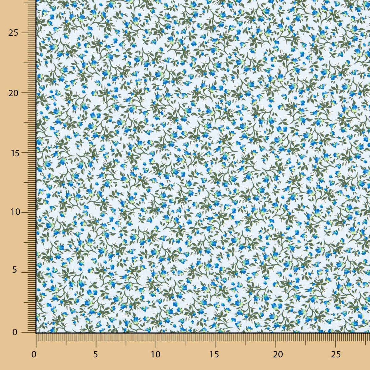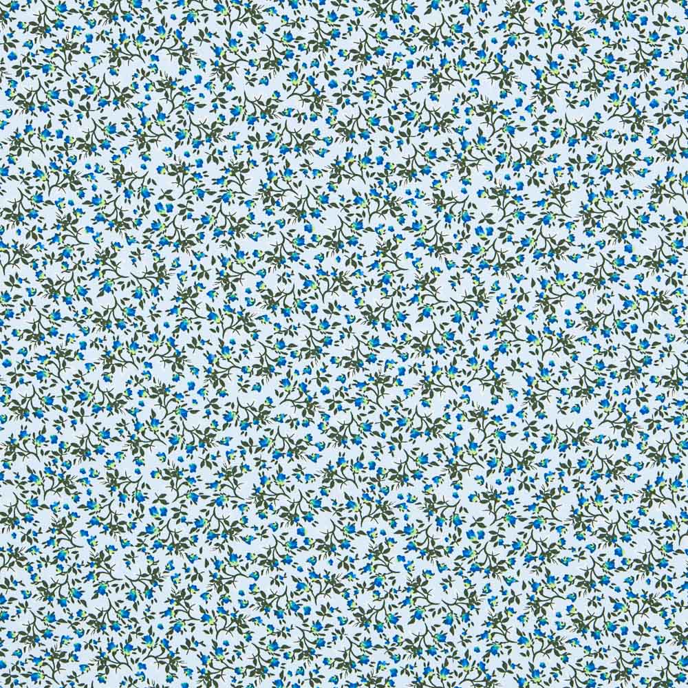 Tela de algodón con estampado flores azul para confeccionar desde camisas a mascarillas. Tela de algodón transpirable, fina y muy suave, caracterizada por su gran versatilidad. El popelín es una tela básica ideal para confeccionar cojines, sábanas, patchwork y todo tipo de decoraciones. Al ser un tejido 100% algodón, es preferible un lavado previo antes de manipular.
