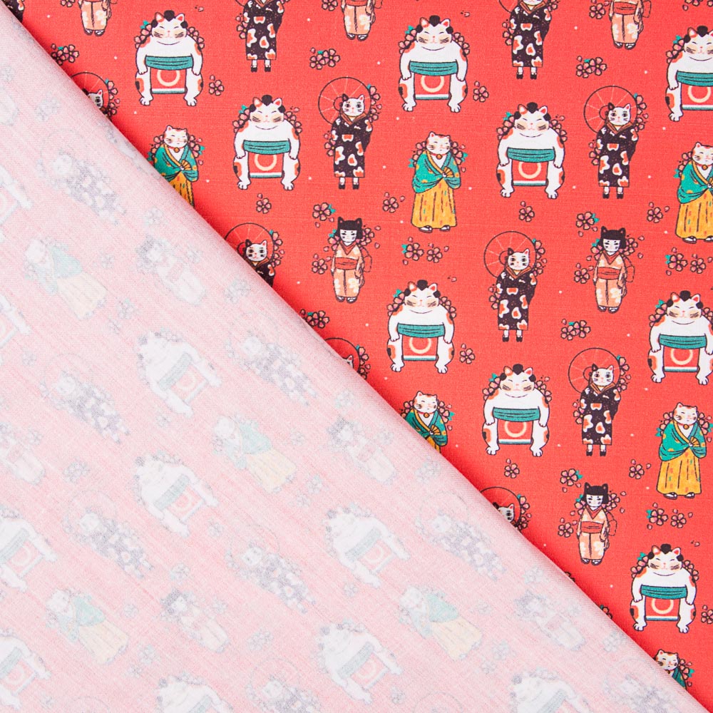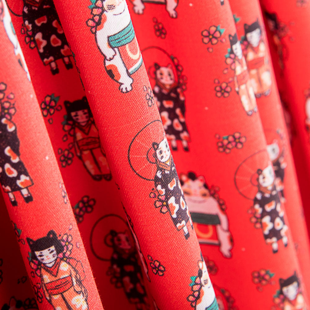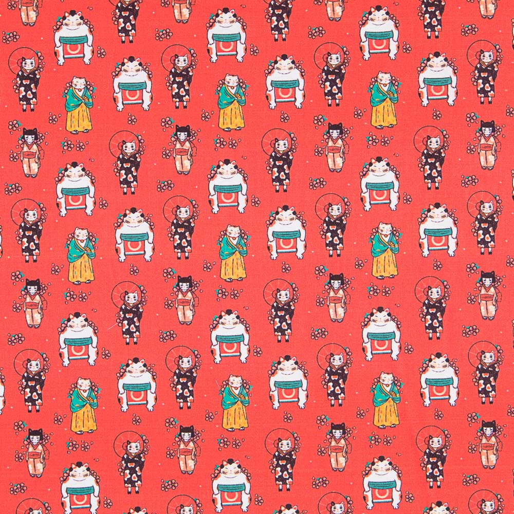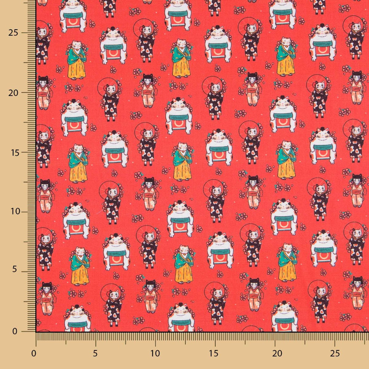 Popelín de algodón estampada gatos vestidos de geisha sobre fondo rojo, ideal para decoración. Tela de algodón transpirable, fina y muy suave, caracterizada por su gran versatilidad. El popelín es una tela básica ideal para confeccionar cojines, sábanas, patchwork y mascarillas. Al ser un tejido 100% algodón, es preferible un lavado previo antes de manipular.