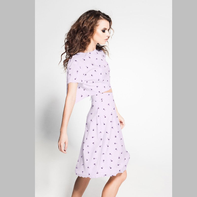 Tela estampada de palmeras sobre una bambula de algodón salmón. La bambula es una tela de algodón muy ligera, fina y sostenida. Tela para vestidos, blusas, faldas y pantalones para la temporada primavera verano. La principal característica de la bambula son los pliegues que forman la textura y el cuerpo de la tela.