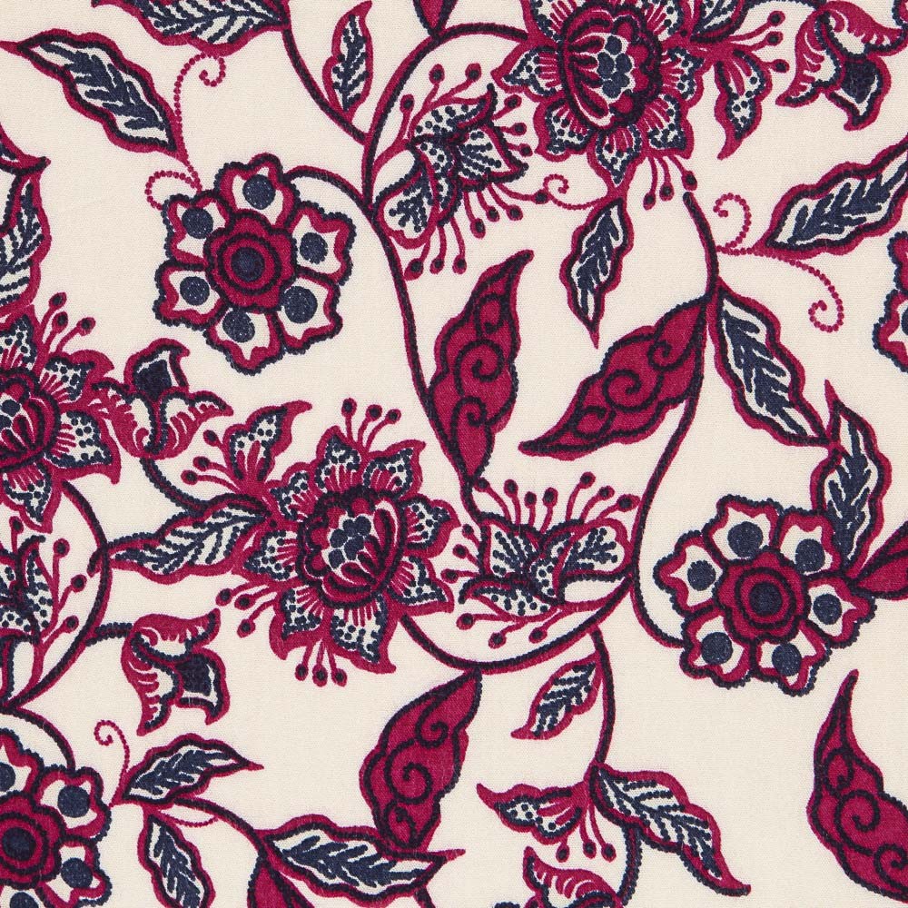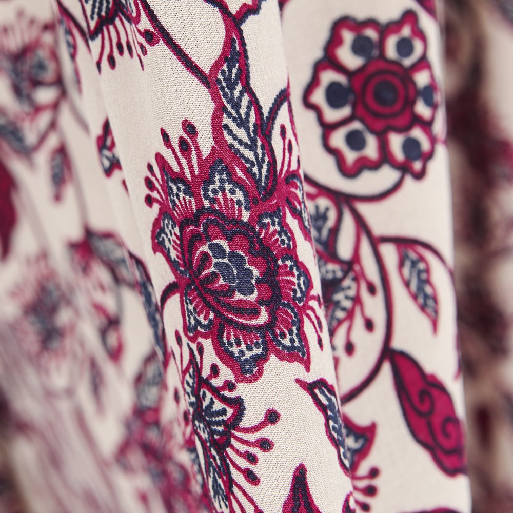 Bambula de viscosa con estampado de flores y topitos. La viscosa es una tela muy fluida, con vuelo, caída y fina, de un tacto especialmente suave y agradable. La viscosa es ideal para confeccionar faldas con vuelo, vestidos frescos con caída, camisas y pantalones.