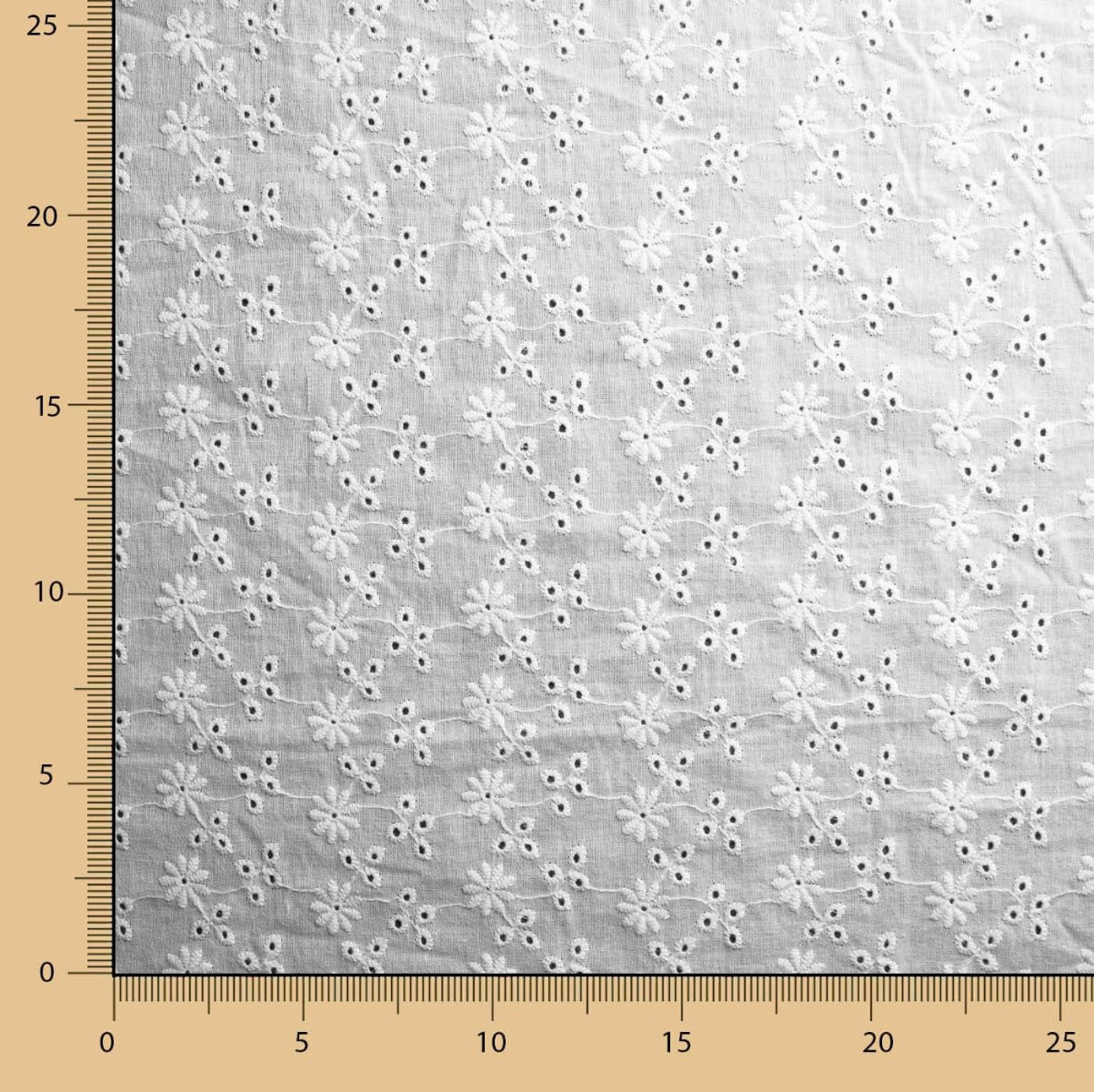 Tela con bordado suizo de dibujo en flor todo en blanco.