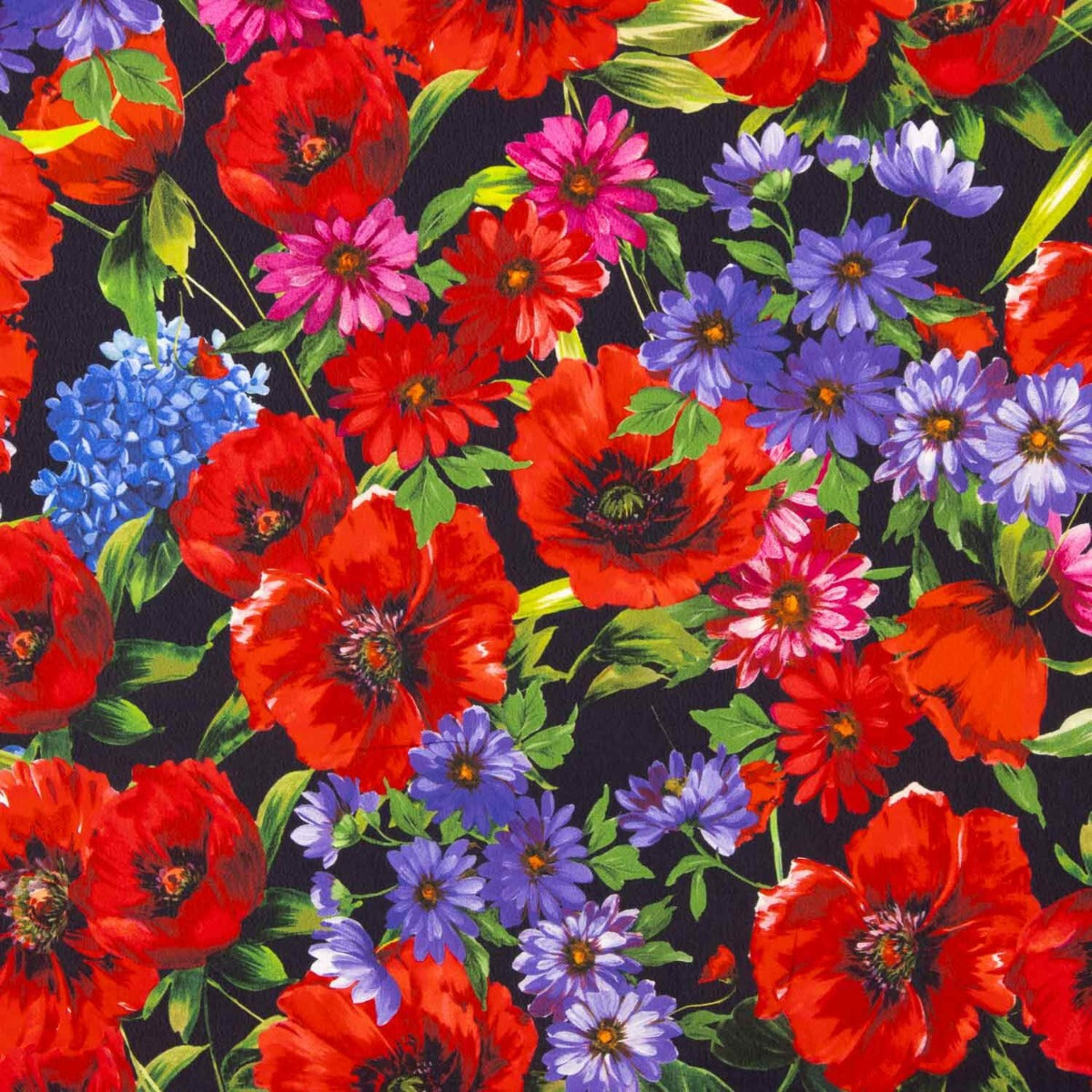 Llena tus creaciones de color y elegancia con esta crepe china de viscosa 100%, estampada con un vibrante diseño floral exclusivo de Ribes y Casals.