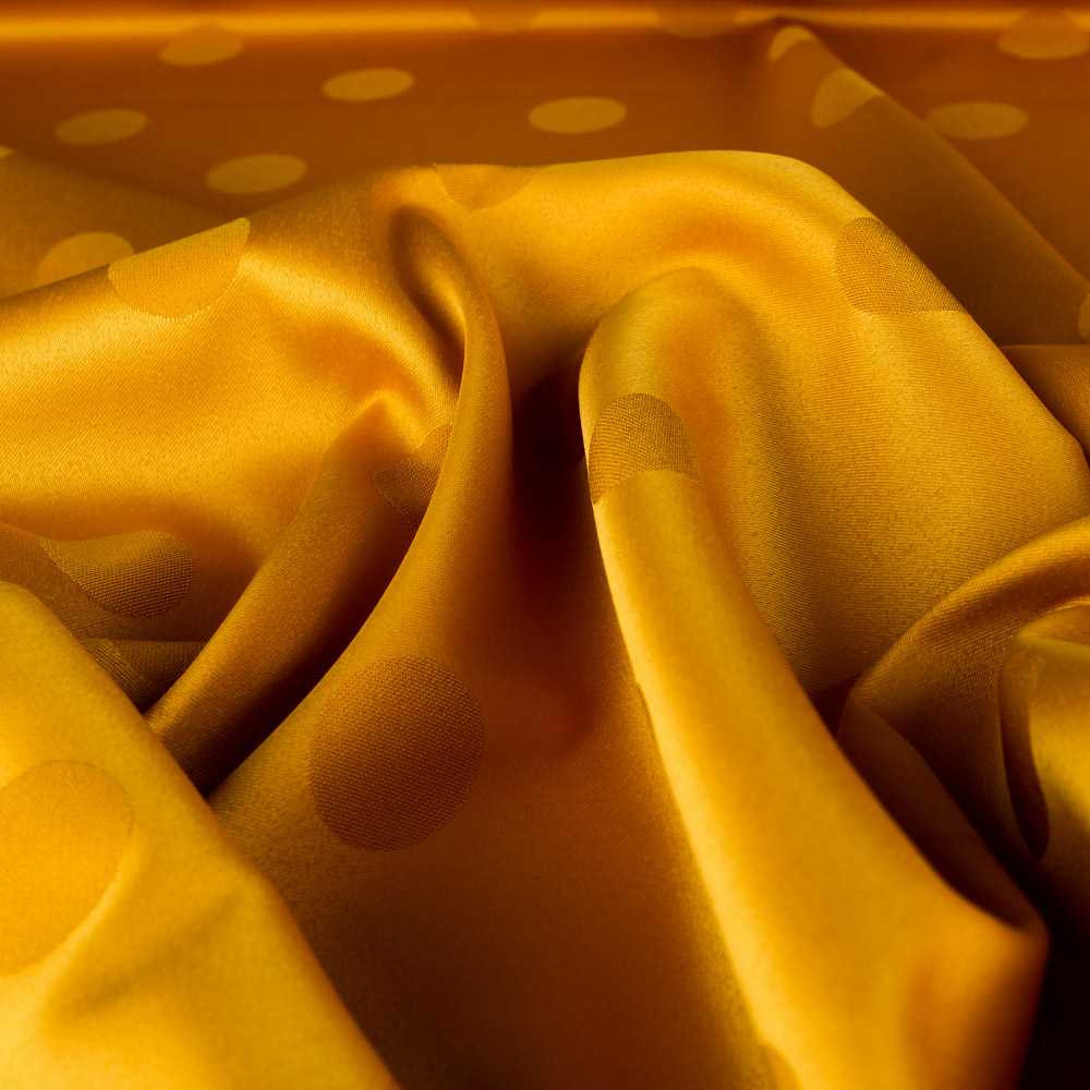 Tela flamenca de lunares Jacquard amarillo albero. Tela elástica para vestidos de flamenca con caída, cuerpo y ligera, cierta elasticidad y la cara exterior satinada. Tela satinada y elástica ideal para trajes de sevillana, faldas y vestidos. Fuera de la moda flamenca también es un tejido perfecto para confeccionar pantalones, americanas o blazers, vestidos, y más aplicaciones de moda causal