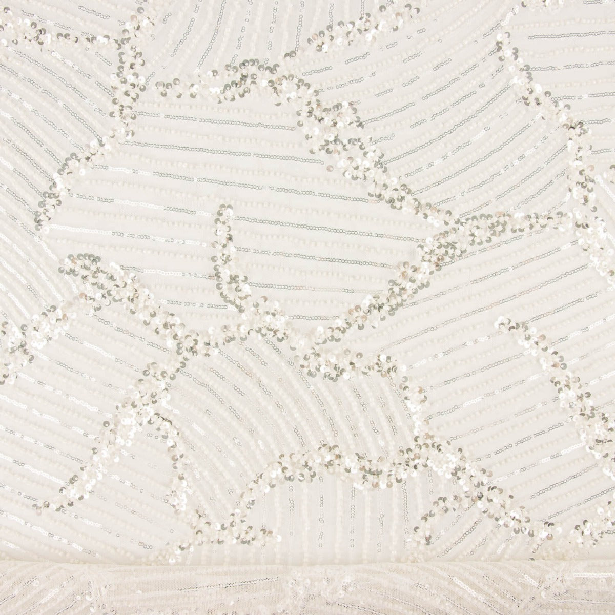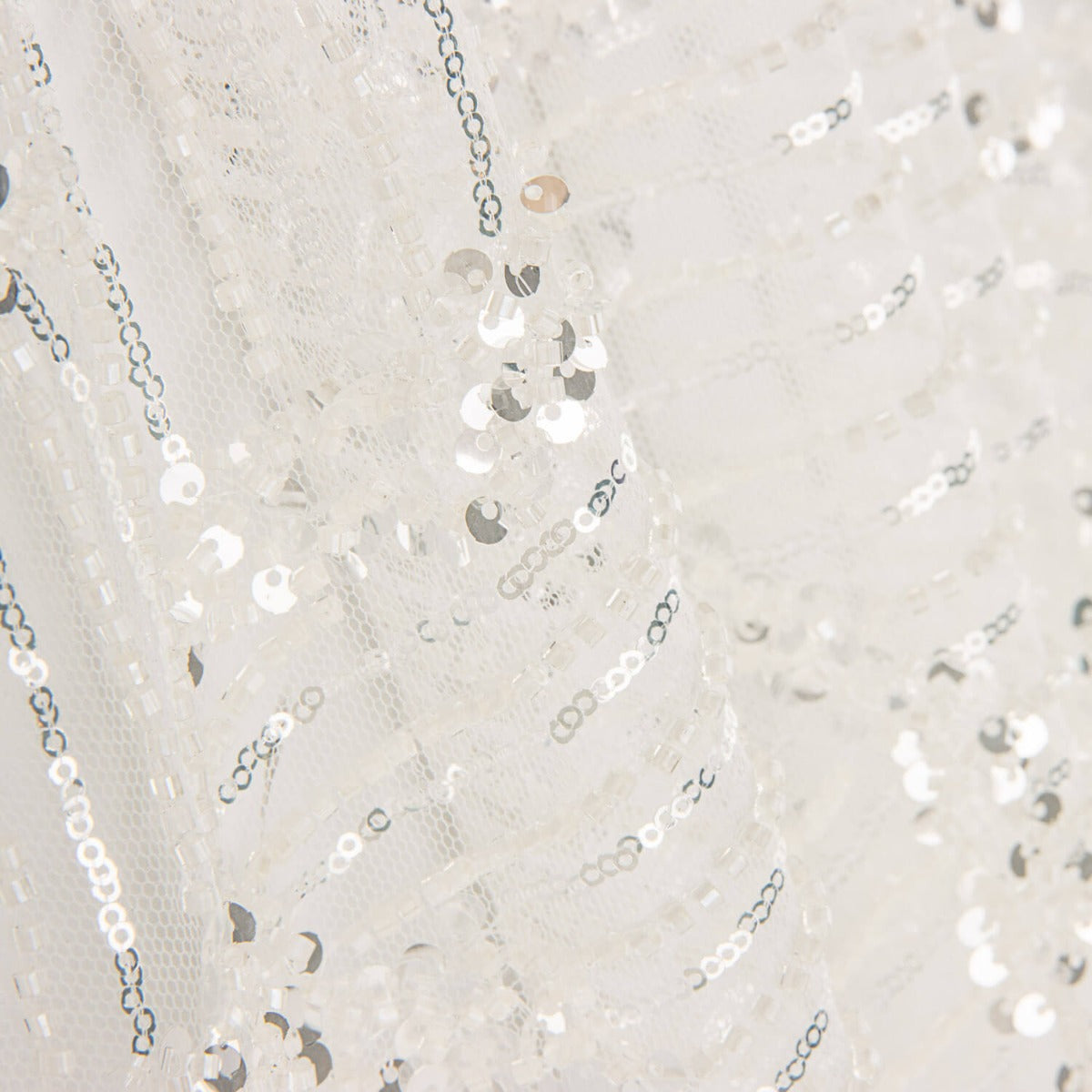 Tela de pedrería con lentejuela modelo bosque con peso. Base de tul transparente de color blanco bordado con cristales y lentejuelas en tonos a juego que aportan destellos y brillos en tus creaciones.