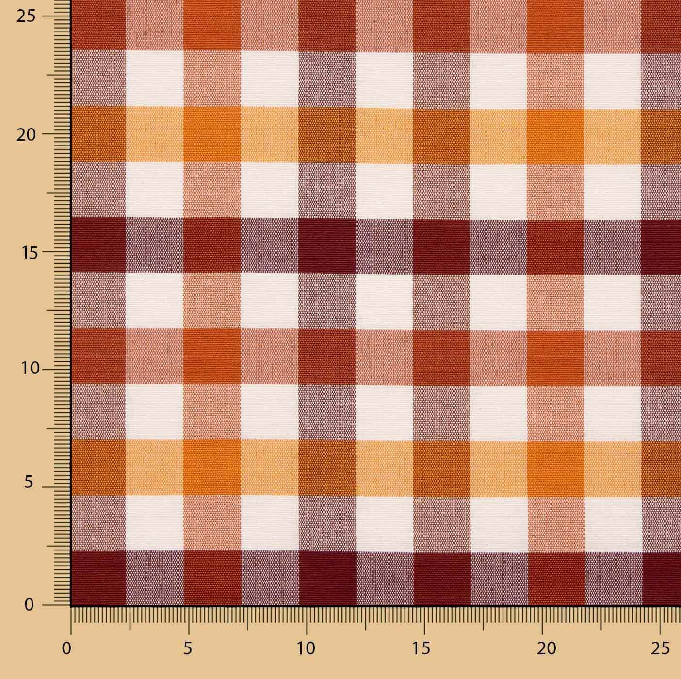 La loneta Cuadros Naranja es un tejido resistente y decorativo con estampado de cuadros en tonalidades cálidas como naranja, caldera y rojo teja. La medida aproximada de cada cuadro es de 2,5 cm por lado, ofreciendo un diseño equilibrado y versátil para múltiples estilos decorativos.