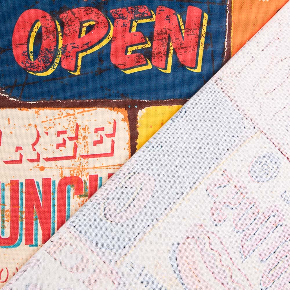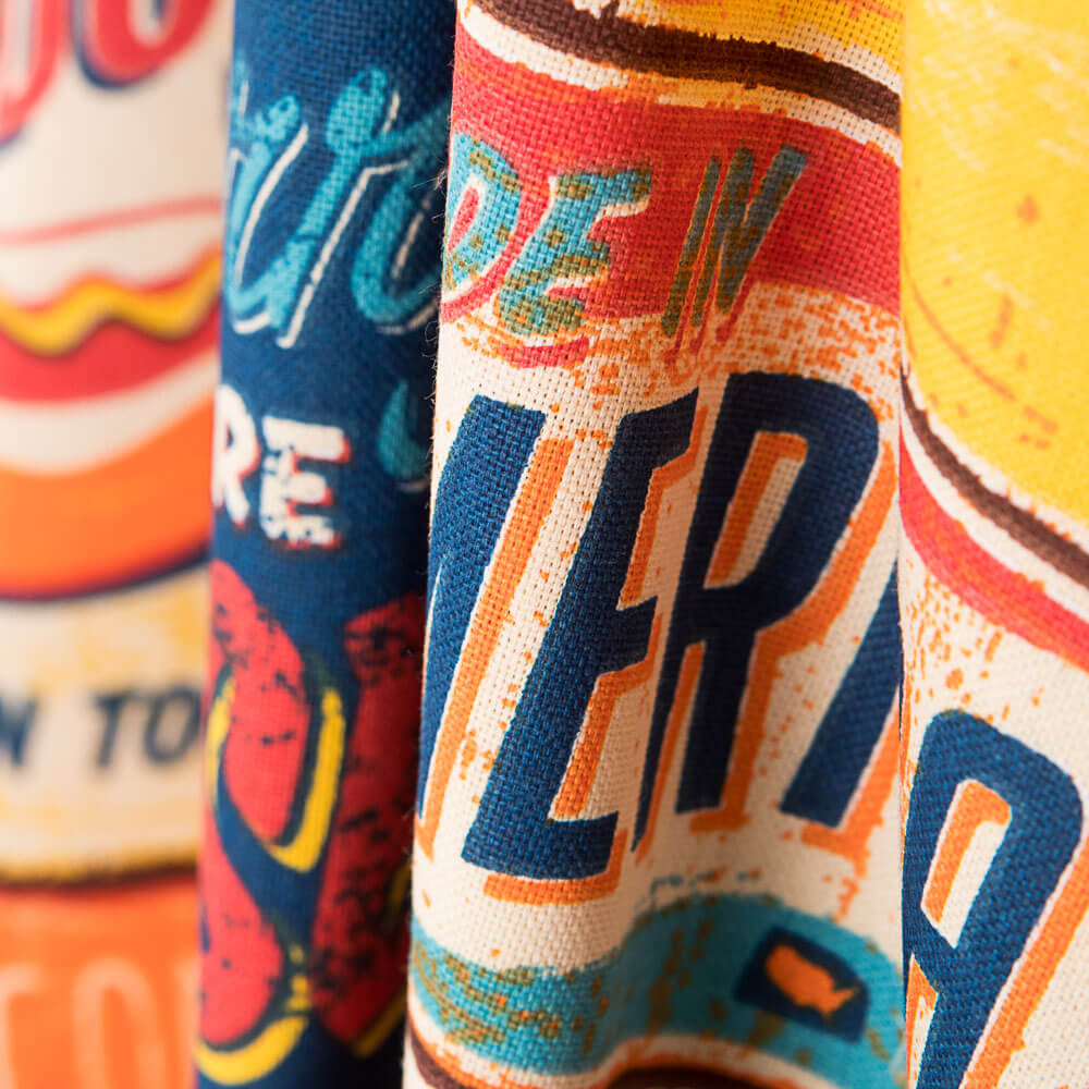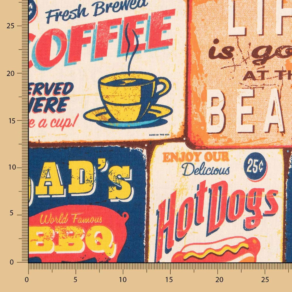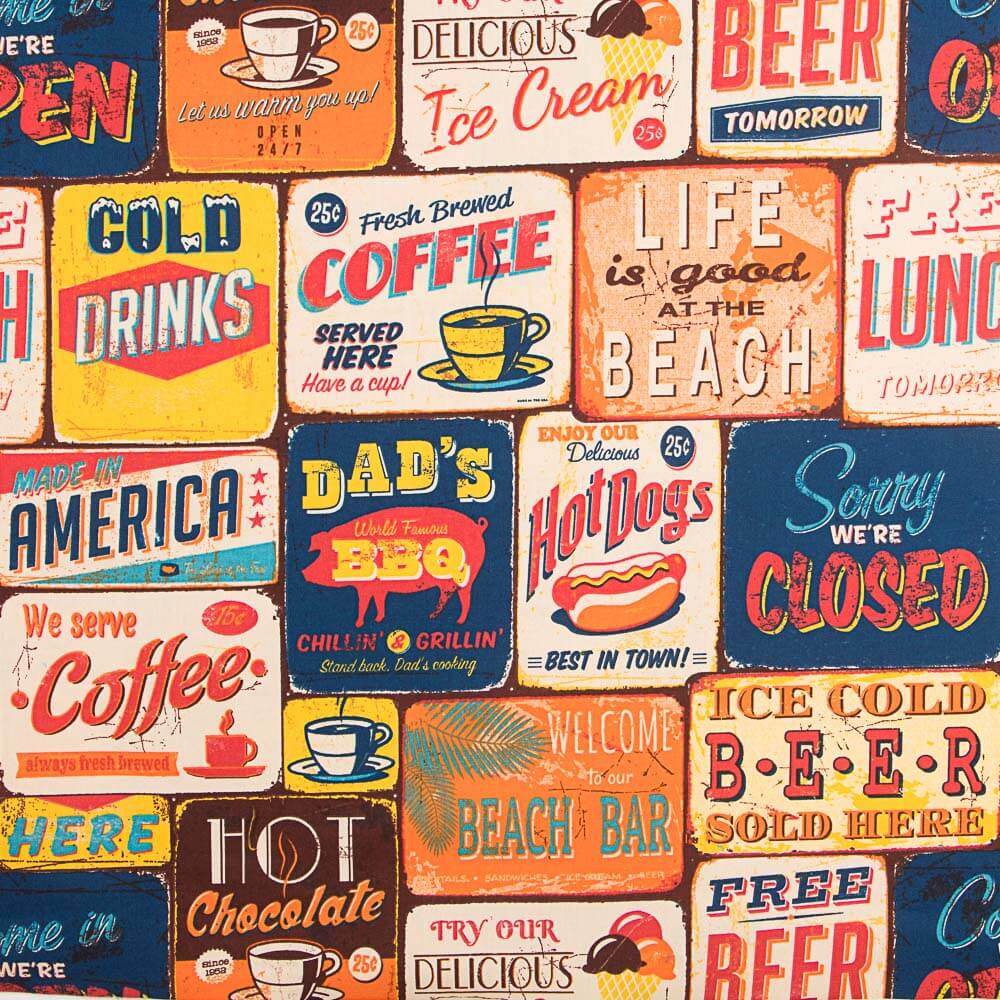 Loneta estampada con letreros de bebidas estilo vintage muy decorativa. Tela para decoración del hogar, confección de cojines, fundas y todo tipo de accesorios. Ya sean bolsos, mochilas y bolsas de tela. Es un tejido totalmente opaco, con caída y suave, con gran resistencia al roce.