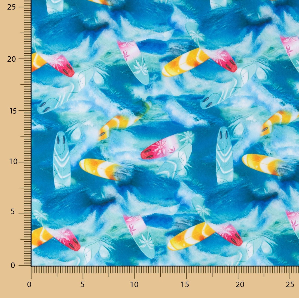 Tela de lycra de baño estampada en colores intensos con dibujo de tablas de surf.